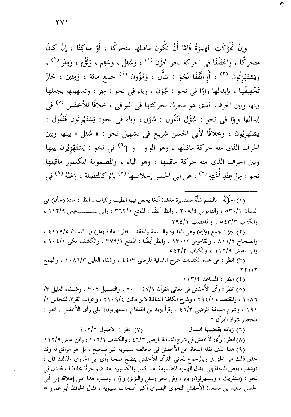 وإن تحركت الهمزة فإما أن يكون ما قبلها متحركًا، أو ساكنًا، إن كان متحركًا، واختلفا في الحركة نحو جؤن، وسئل، وسئم، ولؤم، ومئر، ويستهزئون، أو اتفقا نحو: سأل، ومؤون جمع مائة، ومئين، جاز تخفيفها، بإبدالها واوًا في نحو: جون، وياء في نحو: مير، وتسهيلها بجعلها بينها وبين الحرف الذي هو محرك بحركتها في البواقى، خلافًا للأخفش في إبدالها واوًا في نحو: سؤل فتقول: سول، وياء في نحو: يستهزئون فتقول: يستهزيون، وخلافًا لأبي الحسن شريح في تسهيل نحو: «سئل» بينها وبين الحرف الذي منه حركة ما قبلها، وهو الواو [و] في نحو: يستهزيون بينها وبين الحرف الذي منه حركة ما قبلها، وهو الياء، والمضمومة المكسور ما قبلها نحو: من عند أخته، عن أبي الحسن إخلاصها ياءً كالمتصلة، وعنه في