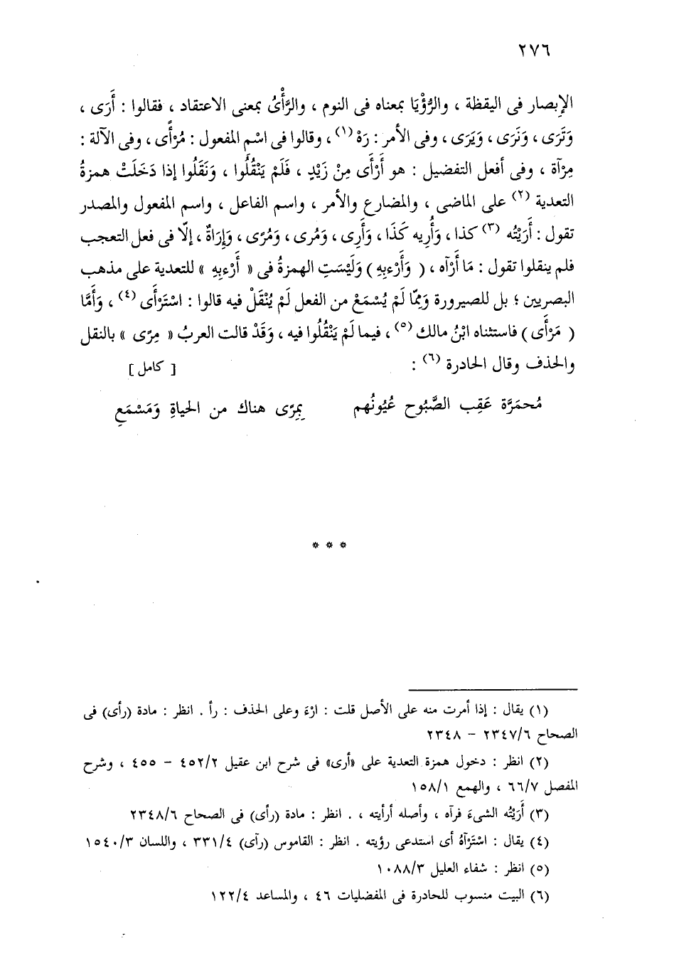 الإبصار في اليقظة، والرؤيا بمعناه في النوم، والرأى بمعنى الاعتقاد، فقالوا: أرى، وترى، ونرى، ويرى، وفي الأمر: ره، وقالوا في اسم المفعول: مرأى، وفي الآلة: مرآة، وفي أفعل التفضيل: هو أرأى من زيد، فلم ينقلوا: ونقلوا إذا دخلت همزة التعدية على الماضي، والمضارع والأمر، واسم الفاعل، واسم المفعول والمصدر تقول: أريته كذا، وأريه كذا، وأرى، ومرى، ومرى، وإراة إلا في فعل التعجب فلم ينقلوا تقول: ما آرآه، (وأرءبه) وليست الهمزة في «أرءبه» للتعدية على مذهب البصريين؛ بل للصيرورة ومما لم يسمع من الفعل لم ينقل فيه قالوا: استرأى، وأما (مرأى) فاستثناه ابن مالك، فيما لم ينقلوا فيه، وقد قالت العرب «مرى» بالنقل والحذف وقال الحادرة: