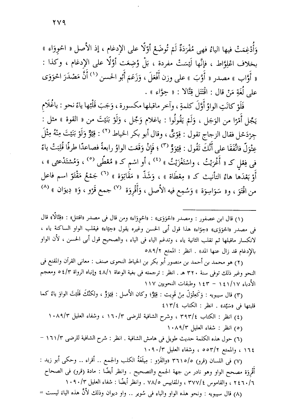 وأدغمت فيها الياء فهي مفردة لم توضع أولاً على الإدغام، إذ الأصل «احوواء» بخلاف اعلواط، فإنها ليست مفردة، بل وضعت أولاً على الإدغام، وكذا: «أواب» مصدر «أوب» على وزن أفعل، وزعم أبو الحسن أن مصدر احووى على لغة من قال: اقتتل قتالا: «حواء».
