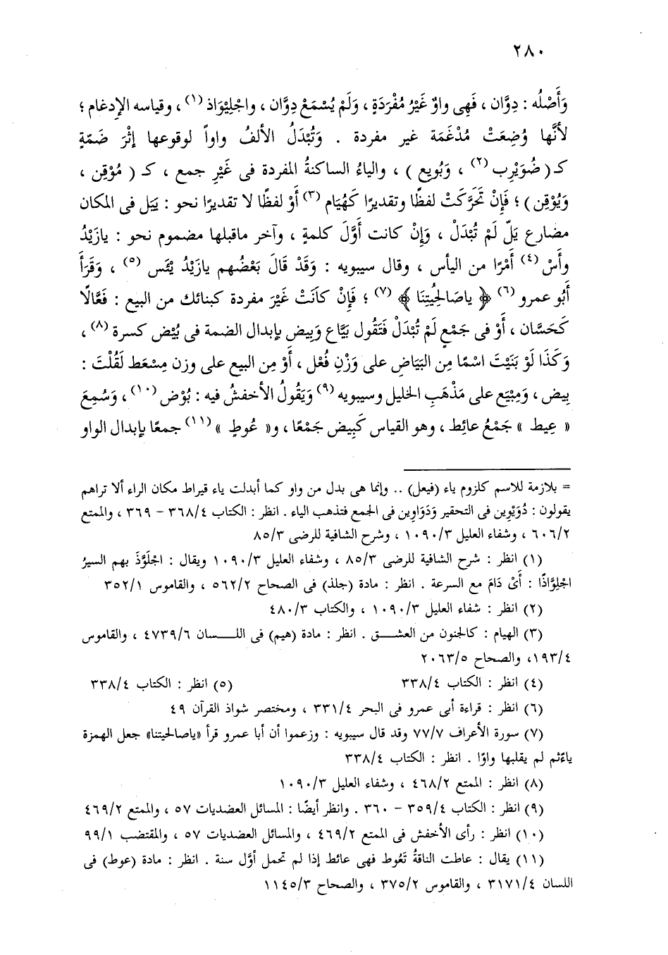 وأصله: دوان، فهي واو غير مفردة، ولم يسمع دوان، واجليواذ، وقياسه الإدغام؛ لأنها وضعت مدغمة غير مفردة. وتبدل الألف واوًا لوقوعها إثر ضمة كـ (ضويرب، وبويع)، والياء الساكنة المفردة في غير جمع، كـ (موقن، ويوقن)؛ فإن تحركت لفظًا وتقديرًا كهيام أو لفظًا لا تقديرًا نحو: يبل في المكان مضارع يل لم تبدل، وإن كانت أول كلمة، وآخر ما قبلها مضموم نحو: يا زيد وأس أمرًا من اليأس، وقال سيبويه: وقد قال بعضهم يا زيد يئس، وقرأ أبو عمرو [يا صالحيتنا]؛ فإن كانت غير مفردة كبنائك من البيع: فعالا كحسان، أو في جمع لم تبدل فتقول بياع وبيض بإبدال الضمة في بيض كسرة، وكذا لو بنيت اسمًا من البياض على وزن فعل، أو من البيع على وزن مسعط لقلت: بيض، ومبيع على مذهب الخليل وسيبويه ويقول الأخفش فيه: بوض، وسمع «عيط» جمع عائط، وهو القياس كبيض جمعًا، و «عوط» جمعًا بإبدال الواو