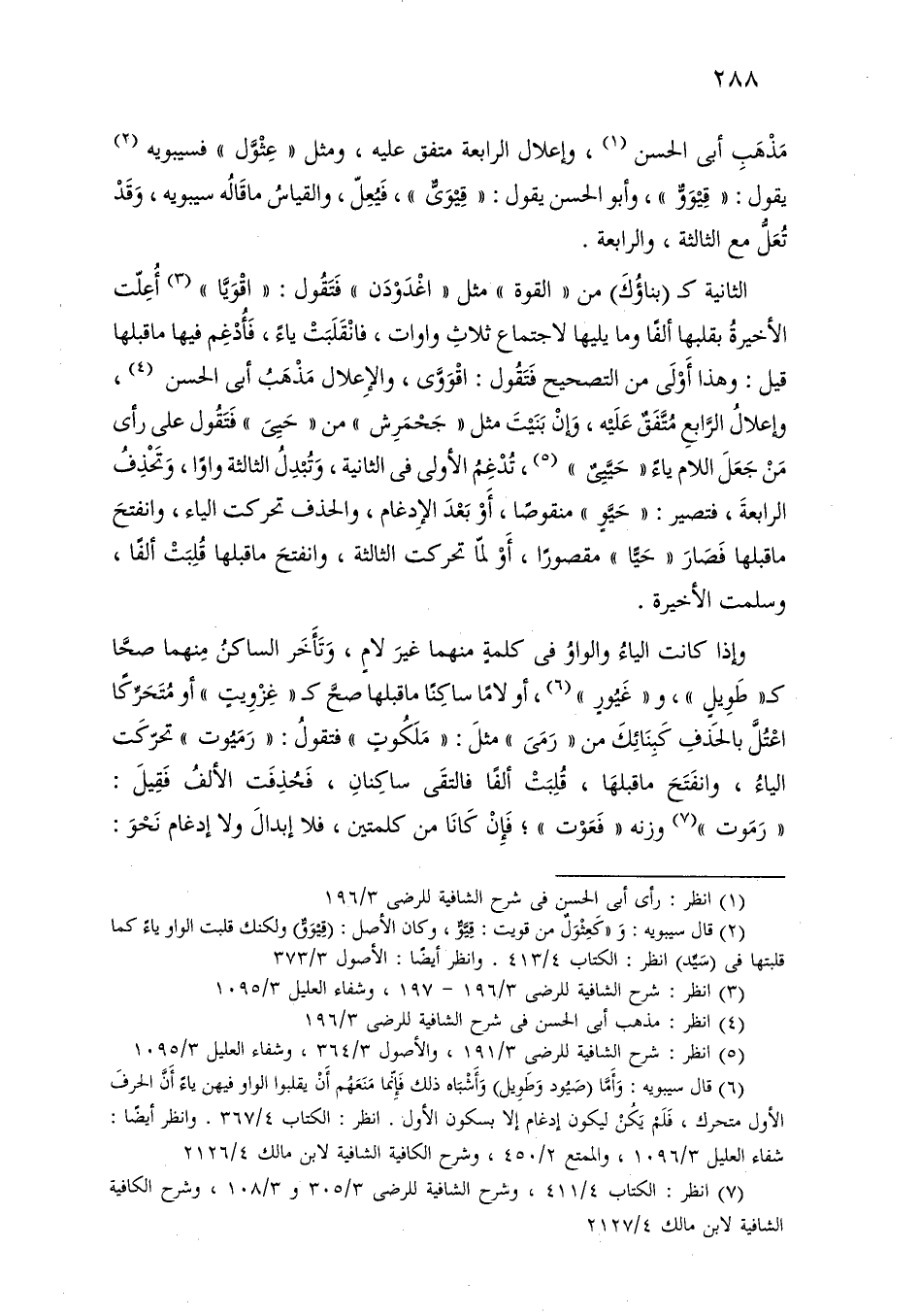 مذهب أبي الحسن، وإعلال الرابعة متفق عليه، ومثل «عثول» فسيبويه يقول: «قيوو»، وأبو الحسن يقول: «قيوى»، فيعل، والقياس ما قاله سيبويه، وقد تعل مع الثالثة، والرابعة.