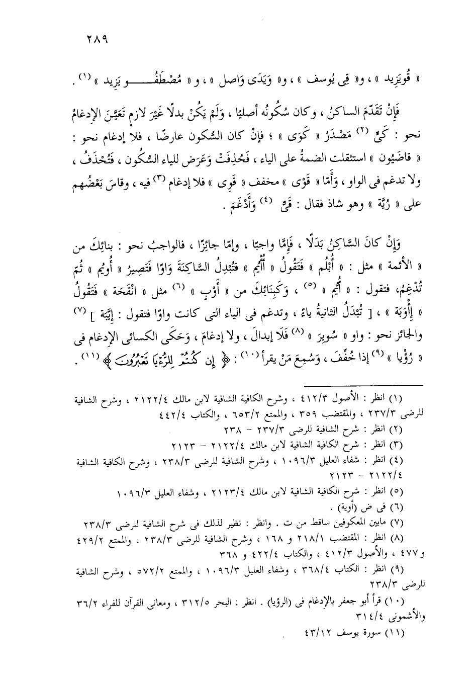 فإن تقدم الساكن، وكان سكونه أصليًا، ولم يكن بدلاً غير لازم تعين الإدغام نحو: كي مصدر «كوى»؛ فإن كان السكون عارضًا، فلا إدغام نحو: «قاضيون» استثقلت الضمة على الياء، فحذفت وعرض للياء السكون، فتحذف، ولا تدغم في الواو، وأما «قوى» مخفف «قوى» فلا إدغام فيه، وقاس بعضهم على «رية» وهو شاذ فقال: قى وأدغم.