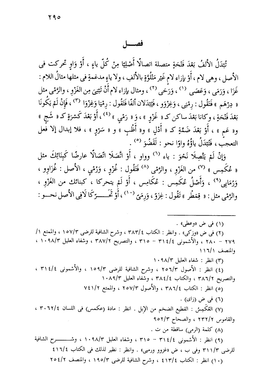 وإن لم يتصلا نحو: ياء وواو، أو اتصلا اتصالاً عارضًا كبنائك مثل «عكمس» من الغزو، والرمى فتقول: غزو، ورمي، الأصل: غزاوو، ورمايى، وأصل عكمس: عكامس، أو لم يتحركا، كبنائك من الغزو، والرمى مثل: «قمطر» تقول: غزو، ورمى، أو تحركا لا في الأصل نحو: