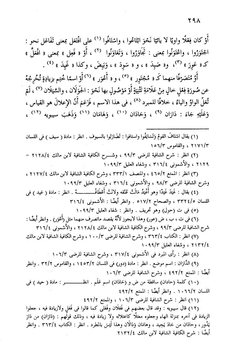 أو متصرفًا منهما كـ «مجتور»، و «أعور» أو اسمًا ختم بزيادة تخرجه عن صورة فعل خال من علامة تثنية أو موصول بها نحو: الجولان، والسيلان، لم تعل الواو والياء، خلافًا للمبرد، في هذا الاسم، فزعم أن الإعلال هو القياس، وعليه جاء: داران، وحادان، وهامان وذهب سيبويه،