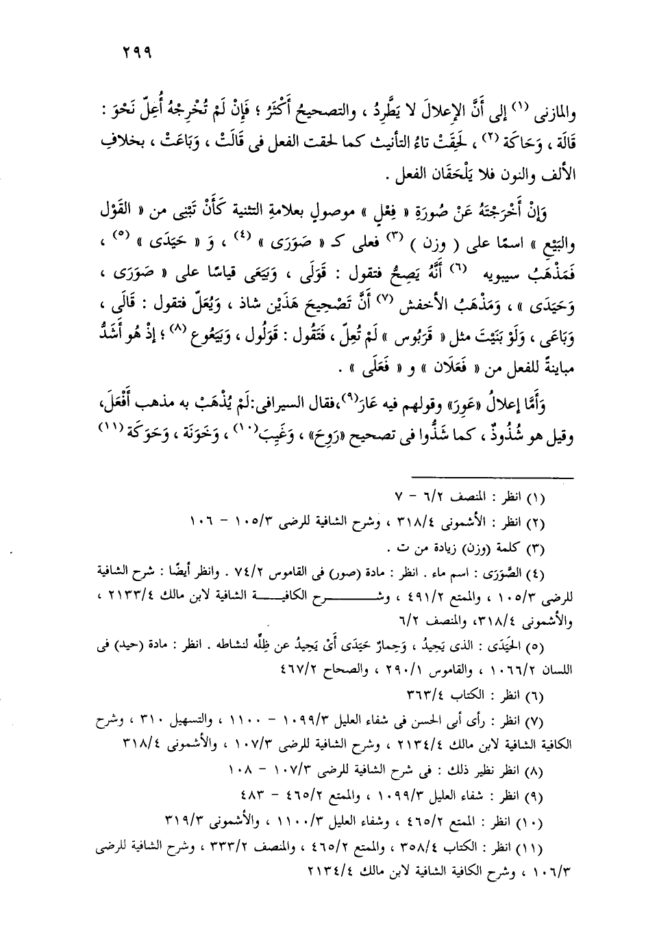 والمازني إلى أن الإعلال لا يطرد، والتصحيح أكثر؛ فإن لم تخرجه أعل نحو: قالة، وحاكة، لحقت تاء التأنيث كما لحقت الفعل في قالت، وباعت، بخلاف الألف والنون فلا يلحقان الفعل.