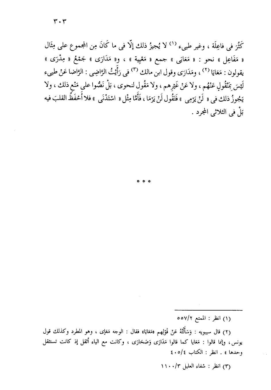 كثر في فاعلة، وغير طيئ لا يجيز ذلك إلا في ما كان من المجموع على مثال «مفاعل» نحو: «معايى» جمع «معيية»، و «مدارى» جمع «مدرى» يقولون: معايا، ومدارى وقول ابن مالك في رأيت الراضي: الراضا عن طيئ ليس بمنقول عنهم، ولا عن غيرهم، ولا مقول لنحوى، بل نصوا على منع ذلك، ولا يجوز ذلك في «لن يرمى» فتقول لن يرما، فأما مثل «استدنى» فلا أحفظ القلب فيه بل في الثلاثي المجرد.