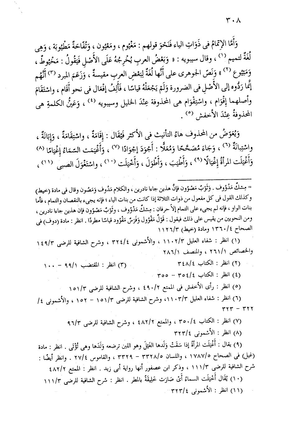 وأما الإتمام في ذوات الياء فنحو قولهم: مغيوم، ومعيون، وتفاحة مطيوبة، وهي لغة لتميم، وقال سيبويه: «وبعض العرب يخرجه على الأصل فيقول: مخيوط، ومبيوع» ونص الجوهري على أنها لغة لبعض العرب مقيسة، وزعم المبرد أنهم إنما ردوه إلى الأصل في الضرورة ولم يجعله قياسًا، فألف إفعال في نحو أقام، واستقام وأصلهما إقوام، واستقوام هي المحذوفة عند الخليل وسيبويه، وعين الكلمة هي المحذوفة عند الأخفش.