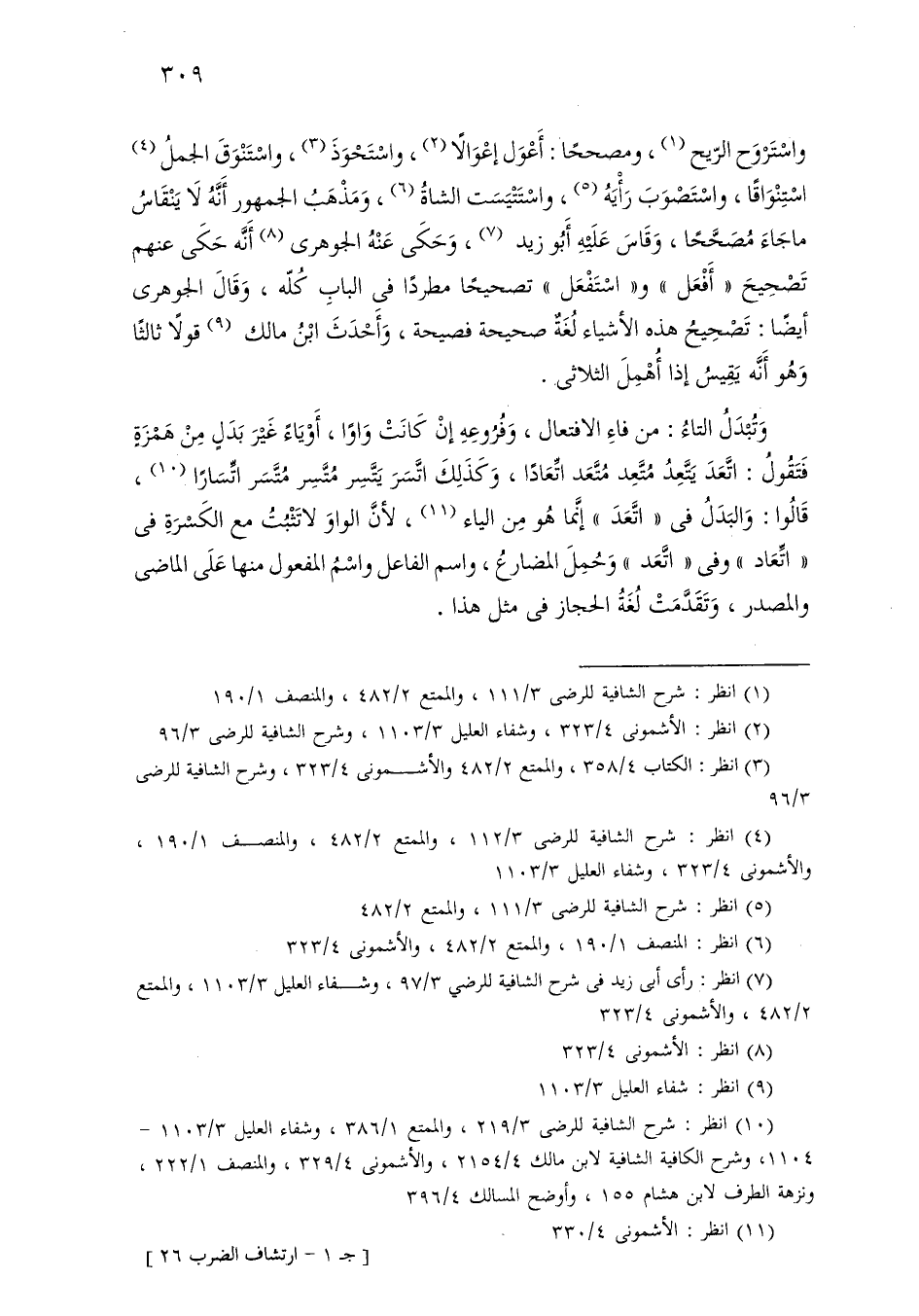 وتبدل التاء: من فاء الافتعال، وفروعه إن كانت واوًا، أو ياء غير بدل من همزة فتقول: اتعد يتعد متعد متعد اتعادًا، وكذلك اتسر يتسر متسر متسر اتسارًا، قالوا: والبدل في «اتعد» إنما هو من الياء، لأن الواو لا تثبت مع الكسرة في «اتعاد» وفي «اتعد» وحمل المضارع، واسم الفاعل واسم المفعول منها على الماضي والمصدر، وتقدمت لغة الحجاز في مثل هذا.
