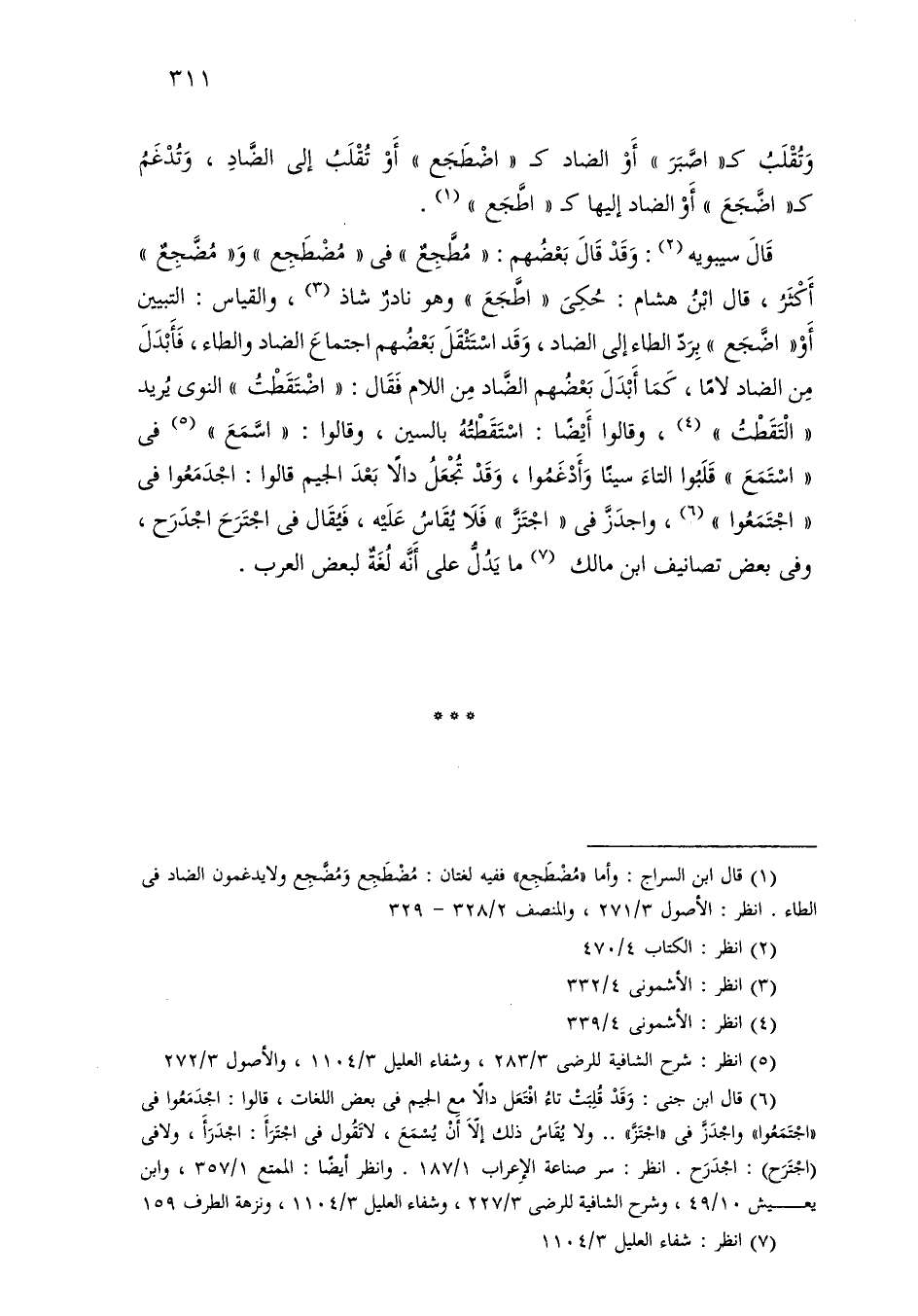 قال سيبويه: وقد قال بعضهم: «مطجع» في «مضطجع» و «مضجع» أكثر، قال ابن هشام: حكى «اطجع» وهو نادر شاذ، والقياس: التبيين أو «اضجع» برد الطاء إلى الضاد، وقد استثقل بعضهم اجتماع الضاد والطاء، فأبدل من الضاد لامًا، كما أبدل بعضهم الضاد من اللام فقال: اضتقطت النوى يريد التقطت، وقالوا أيضًا: استقطته بالسين، وقالوا: اسمع في استمع قلبوا التاء سينًا وأدغموا، وقد تجعل دالاً بعد الجيم قالوا: اجدمعوا في اجتمعوا، واجز في اجتز فلا يقال عليه، فيقال في اجترح اجدرح، وفي بعض تصانيف ابن مالك ما يدل على أنه لغة لبعض العرب.