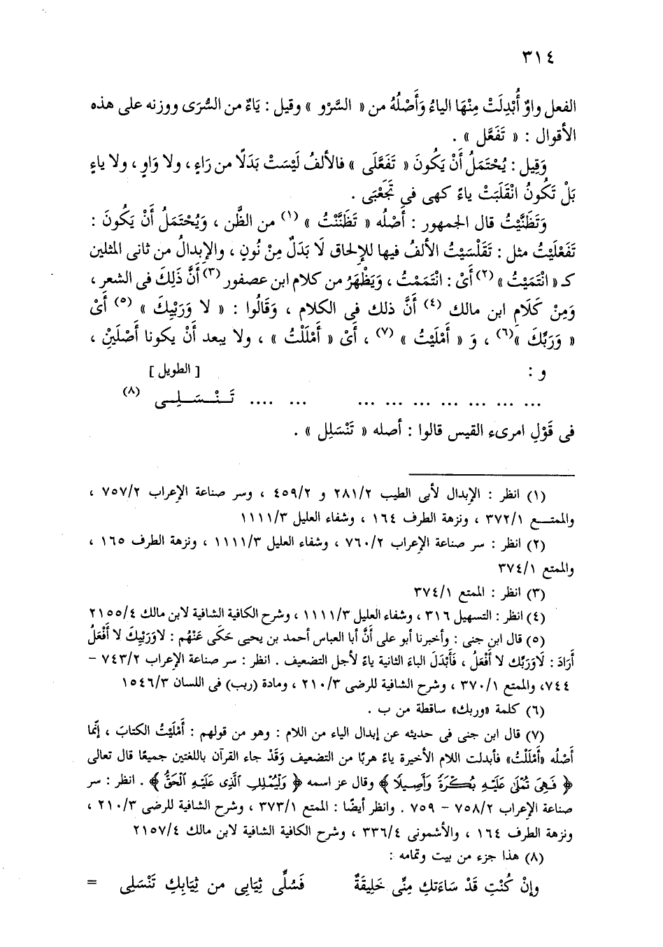 وتظنيت قال الجمهور: أصله تظننت من الظن، ويحتمل أن يكون: تفعليت مثل: تقلسيت الألف فيها للإلحاق لا بدل من نون، والإبدال من ثاني المثلين كـ «انتميت» أي: انتممت، ويظهر من كلام ابن عصفور أن ذلك في الشعر، ومن كلام ابن مالك أن ذلك في الكلام، وقالوا: لا وربيك أي وربك، و «أمليت»، أي أمللت، ولا يبعد أن يكونا أصلين، و: