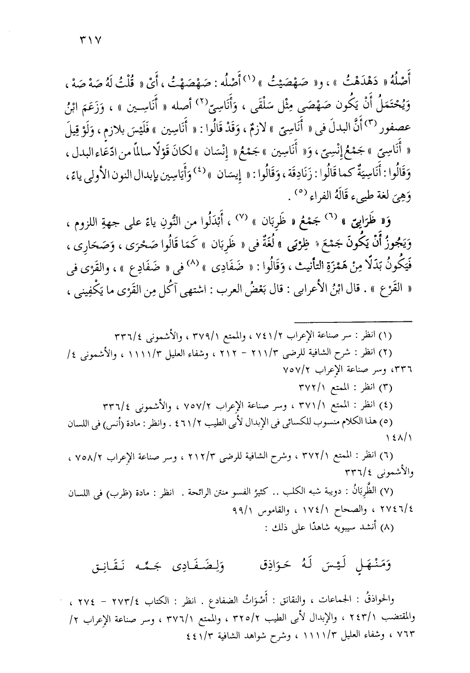 أصله دهدهت، وصهصيت أصله: صهصهت، أي «قلت له صه صه، ويحتمل أن يكون صهصى مثل سلقى، وأناسى أصله أناسين، وزعم ابن عصفور أن البدل في أناسى لازم، وقد قالوا: أناسين فليس بلازم، ولو قيل أناسى جمع إنسى، و «أناسين» جمع إنسان لكان قولاً سالمًا من إدعاء البدل، وقالوا: أناسية كما قالوا: زنادقة، وقالوا: إيسان وأياسين بإبدال النون الأولى ياء، وهي لغة طيئ قاله الفراء».