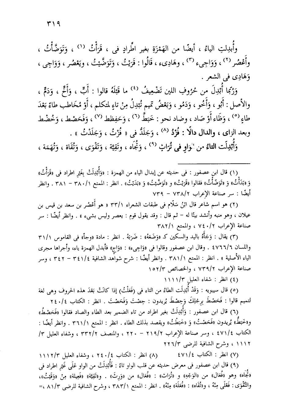 وربما أبدل من حروف اللين تضعيف ما قبله قالوا: أب، وأخ، ودم، والأصل: أبو، وأخو، ودمو، وبعض تميم تبدل من تاء لمتكلم، أو مخاطب طاء بعد طاء، وظاء أو صاد، وضاد نحو: خبط، وحفظط، وفحصط، وخضط وبعد الزاي، والدال دالاً: فزد، وجلد في «فزت، وجلدت».