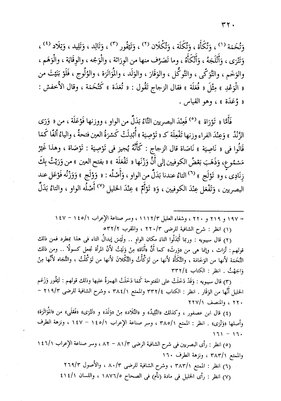 وتخمة، وتكأة، وتكلة، وتكلان، وتيقور، وتالد، وتليد، وتلاد، وتترى، وأتلجه، وأتكأه، وما تصرف منها من الوراثة، والوجه، والوقاية، والوهم، والوخم، والتوكى، والتوكل، والوقار، والولد، والمواترة، والولوج، فلو بنيت من «الوعد» مثل فعلة فقال الزجاج تقول: تعدة كتخمة، وقال الأخفش: وعدة، وهو القياس.