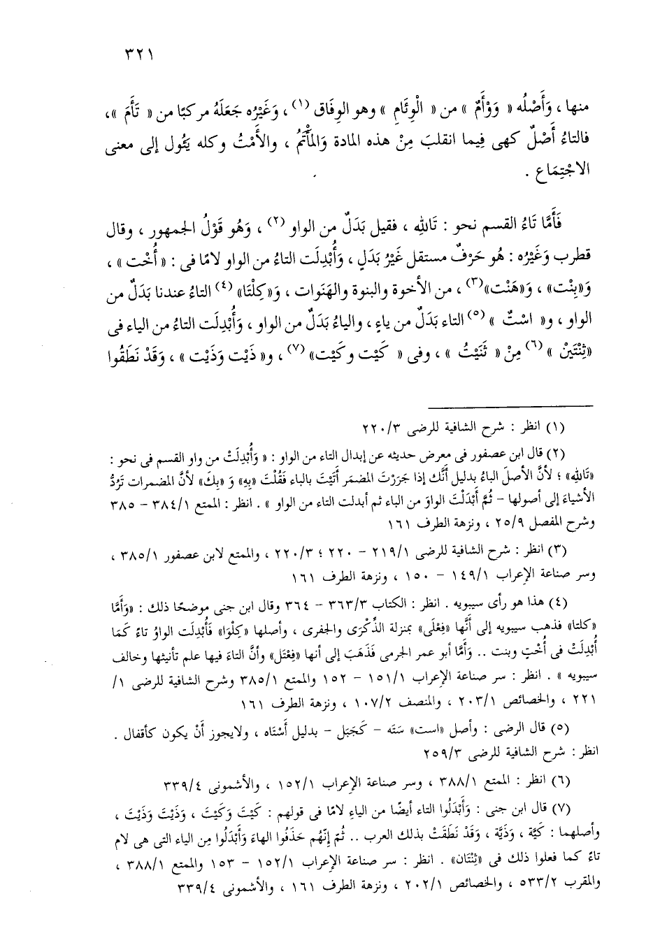 فأما تاء القسم نحو: تالله، فقيل بدل من الواو، وهو قول الجمهور، وقال قطرب وغيره: هو حرف مستقل غير بدل، وأبدلت التاء من الواو لامًا في: «أخت»، و «بنت»، و «هنت»، من الأخوة والبنوة والهنوات، و «كلتا» التاء عندنا بدل من الواو، و «است» التاء بدل من ياء، والياء بدل من الواو، وأبدلت التاء من الياء في ثنتين من ثنيت، وفي كيت وكيت، و «ذيت وذيت»، وقد نطقوا