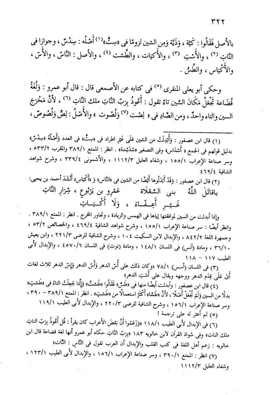 وحكى أبو يعلى المنقري في كتابه الأصمعي قال: قال أبو عمرو: ولغة قضاعة تجعل مكان السين تاء تقول: أعوذ برب النات ملك النات، لأن مخرج السين والتاء واحد، ومن الصاد في لصت ولصوت والأصل: لص ولصوص،