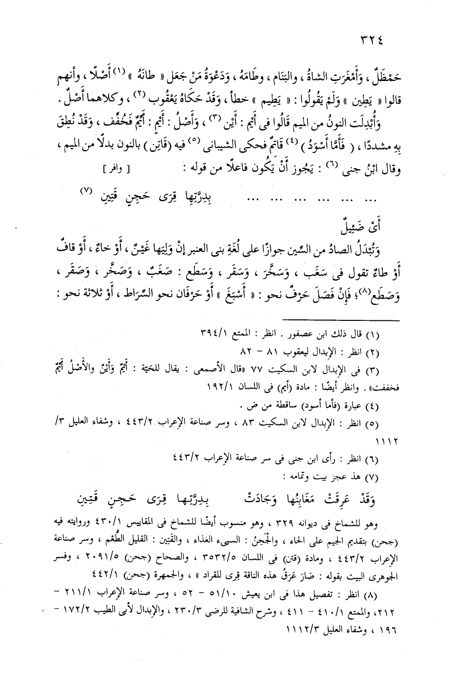 وتبدل الصاد من السين جوازًا على لغة بني العنبر إن وليها غين، أو خاء، أو قاف أو طاء تقول في سغب، وسخر، وسقر، وسطع: صغب، وصخر، وصقر، وصطع؛ فإن فصل حرف نحو: «أسبغ» أو حرفان نحو السراط، أو ثلاثة نحو: