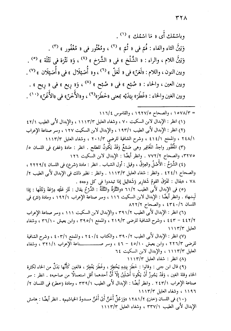 وبين العين، والحاء: «صبع» في «صبح»، و «ريع» في «ريح».