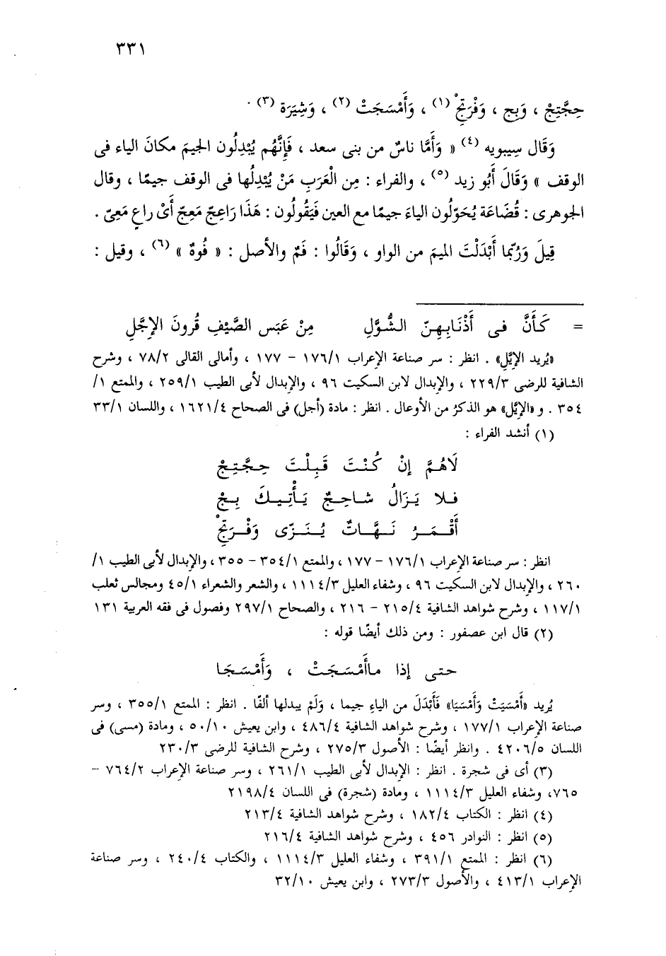 وقال سيبويه «وأما ناس من بني سعد، فإنهم يبدلون الجيم مكان الياء في الوقف» وقال أبو زيد، والفراء: من العرب من يبدلها في الوقف جيمًا، وقال الجوهري: قضاعة يحولون الياء جيمًا مع العين فيقولون: هذا راعج معج أي راع معي.