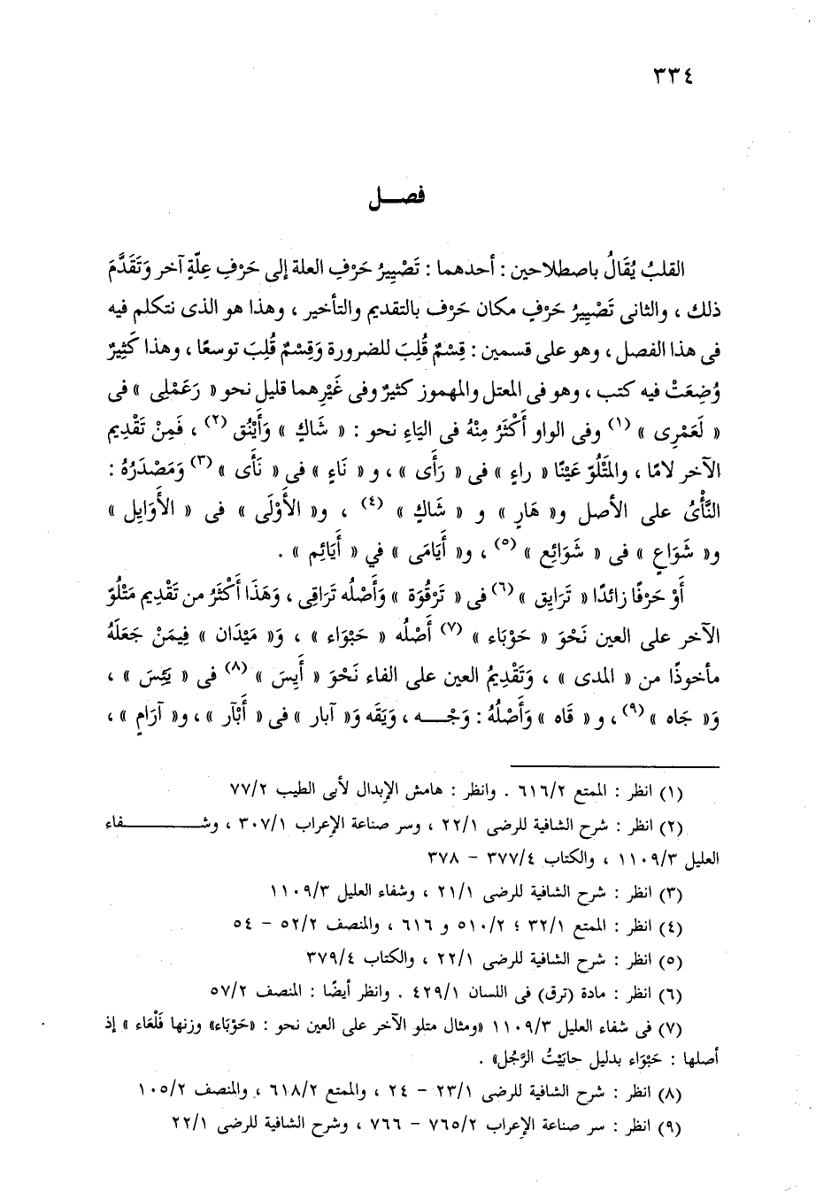 القلب يقال باصطلاحين: أحدهما: تصيير حرف العلة إلى حرف علة آخر وتقدم ذلك، والثاني تصيير حرف مكان حرف بالتقديم والتأخير، وهذا هو الذي نتكلم فيه في هذا الفصل، وهو على قسمين: قسم قلب للضرورة وقسم قلب توسعًا، وهذا كثير وضعت فيه كتب، وهو في المعتل والمهموز كثير وفي غيرهما قليل نحو «رعملى» في «لعمرى» وفي الواو أكثر منه في الياء نحو: «شاك» وأينق، فمن تقديم الآخر لامًا، والمتلو عينًأ «راء» في «رأي»، و «ناء» في «نأى» ومصدرة: النأى على الأصل و «هار» و «شاك»، و «الأولى» في «الأوايل» وشواع في «شوائع»، و «أيامى» في «أيائم».