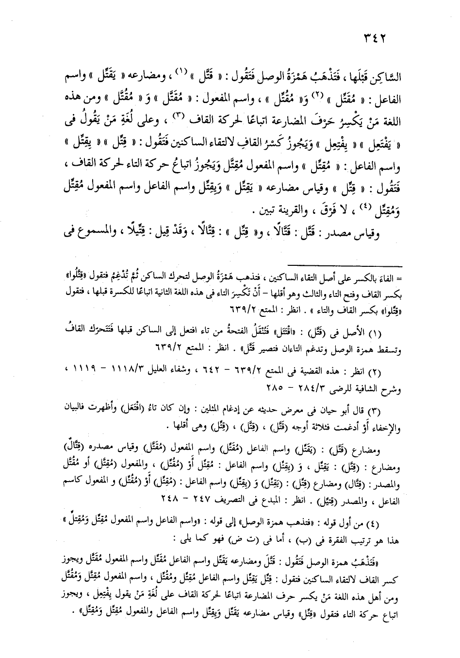 الساكن قبلها، فتذهب همزة الوصل فتقول: قتل، ومضارعه يقتل واسم الفاعل: مقتل و «مقتل»، واسم المفعول: مقتل و «مقتل» ومن هذه اللغة من يكسر حرف المضارعة اتباعًا لحركة القاف، وعلى لغة من يقول في «يفتعل» «يفتعل» ويجوز كسر القاف لالتقاء الساكنين فتقول: قتل يقتل واسم الفاعل: مقتل واسم المفعول مقتل ويجوز اتباع حركة التاء لحركة القاف، فتقول: قتل وقياس مضارعه يقتل ويقتل واسم الفاعل واسم المفعول مقتل ومقتل، لا فرق، والقرينة تبين.