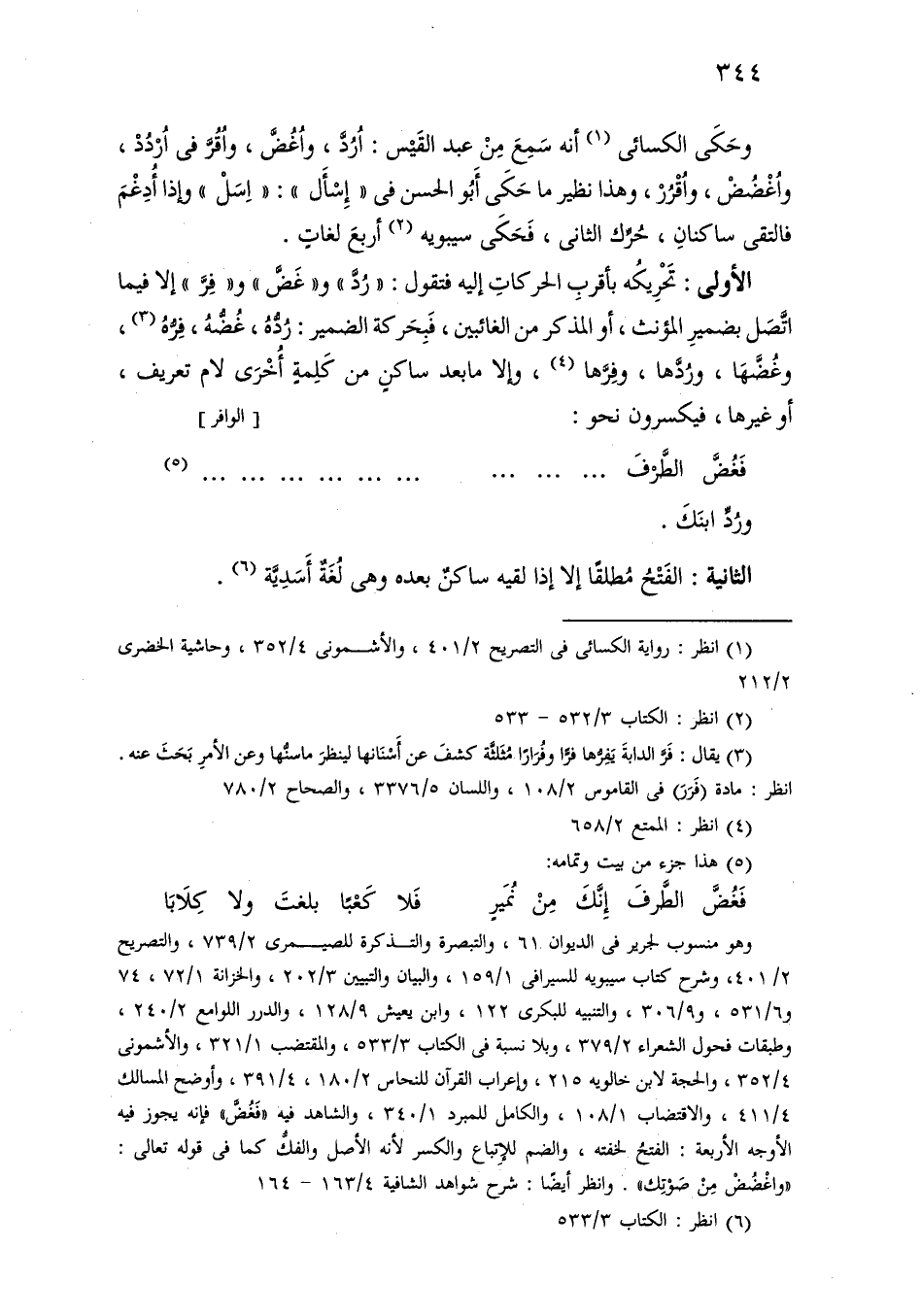 وحكى الكسائي أنه سمع من عبد القيس: أرد، وأعض، وأقر في أردد، وأغضض، واقرر، وهذا نظير ما حكى أبو الحسن في إسأل: اسل وإذا أدغم فالتقى ساكنان، حرك الثاني، فحكى سيبويه أربع لغات.
