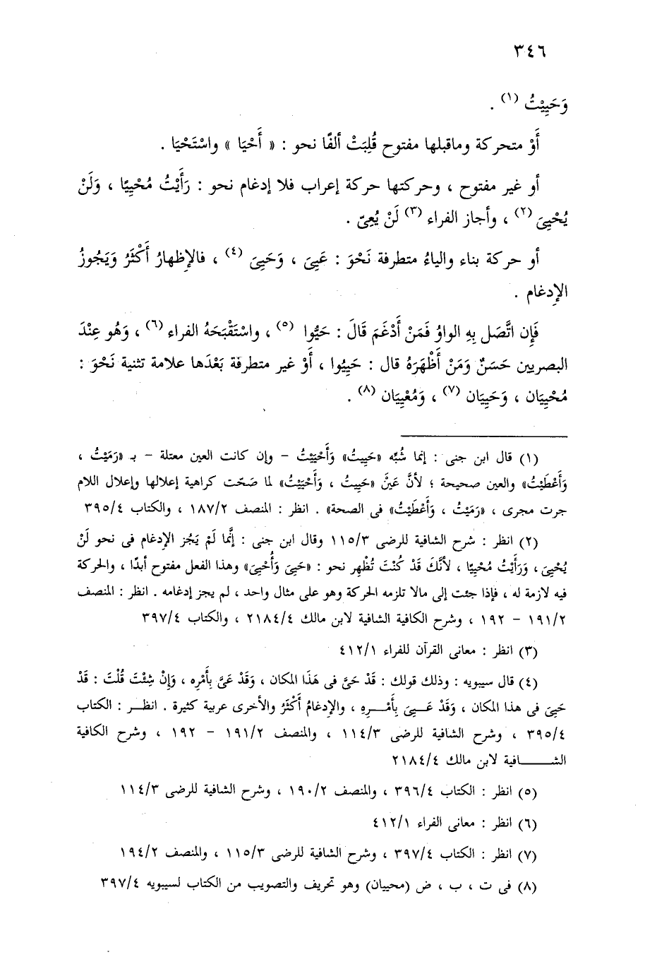 فإن اتصل به الواو فمن أدغم قال: حيوا، واستقبحه الفراء، وهو عند البصريين حسن ومن أظهره قال: حييوا، أو غير متطرفة بعدها علامة تثنية نحو: محييان، وحييان، ومعييان.