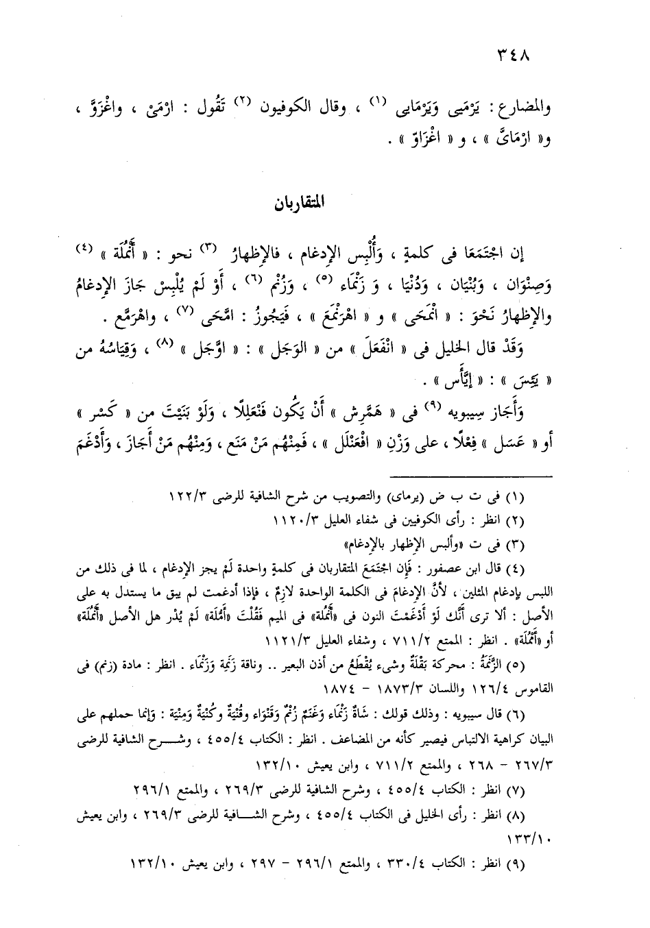 إن اجتمعا في كلمة، وألبس الإدغام، فالإ؟ هار نحو: «أنملة» وصنوان، وبنيان، ودنيا، وزنماء، وزنم، أو لم يلبس جاز الإدغام والإظهار نحو: «انمحى» و «اهرنمع»، فيجوز: امحى، واهرمع.