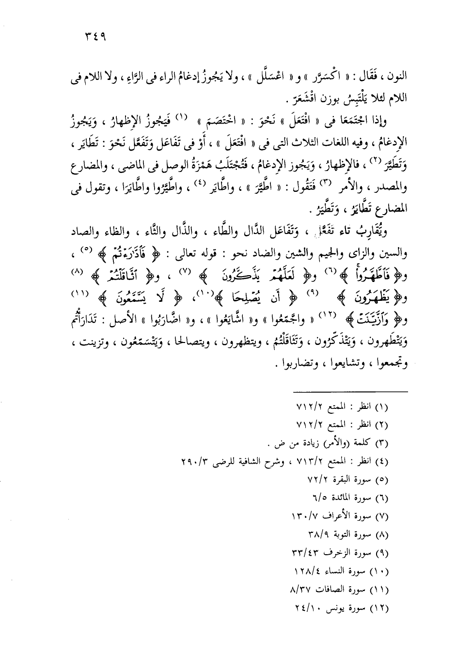 ويقارب تاء تفعل، وتفاعل الدال والطاء، والذال والثاء، والظاء والصاد والسين والزاي والجيم الشين والضاد نحو: قوله تعالى: [فادارءتم]، و [فاطهروا] و [لعلهم يذكرون]، و [اثاقلتم] و [يظهرون] [أن يصلحا]، [لا يسمعون] و [وازينت] «واجمعوا» و «اشايعوا»، و «اضاربوا» الأصل: تدرأتم ويتطهرون، ويتذكرون، وتثاقلتم، ويتظهرون، ويتصالحا، ويتسمعون، وتزينت، وتجمعوا، وتشايعوا، وتضاربوا.