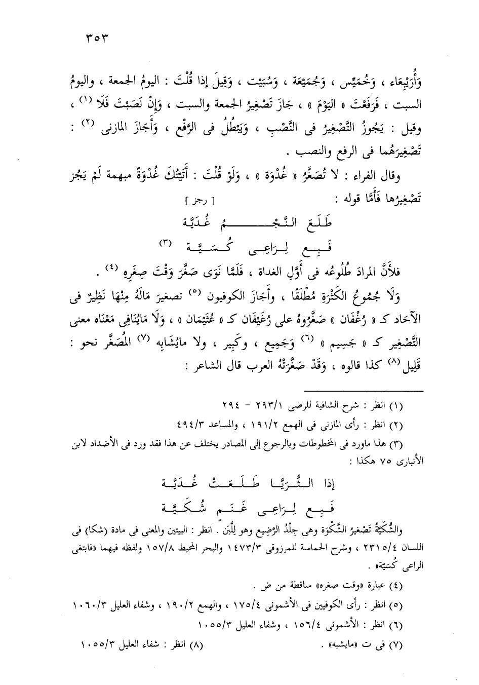 وأربيعاء، وخميس، وجميعة، وسبيت، وقيل إذا قلت: اليوم الجمعة، واليوم السبت، فرفعت «اليوم»، جاز تصغير الجمعة والسبت، وإن نصبت فلا، وقيل: يجوز التصغير في النصب، ويبطل في الرفع، وأجاز المازني: تصغيرهما في الرفع والنصب.