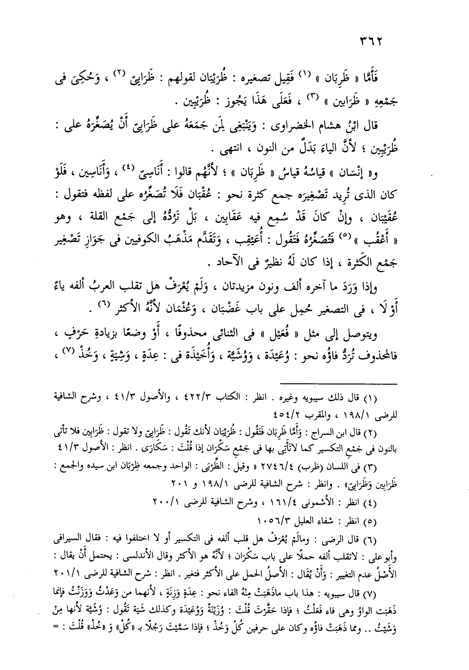 قال ابن هشام الخضراوي: وينبغي لمن جمعه على ظرابى أن يصغره على: ظريبين؛ لأن الياء بدل من النون، انتهى.