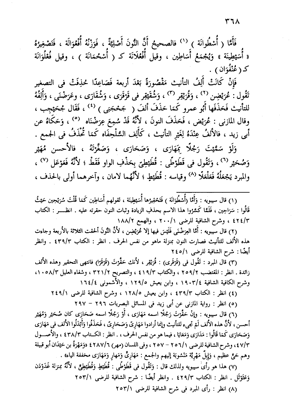 فأما (أسطوانة) فالصحيح أن النون أصلية، فوزنه أفعوالة، فتصغيره «أسيطنة» ويجمع أساطين، وقيل أفعلانة كـ (أسحمانة)، وقيل فعلوانة كـ (عنفوان).