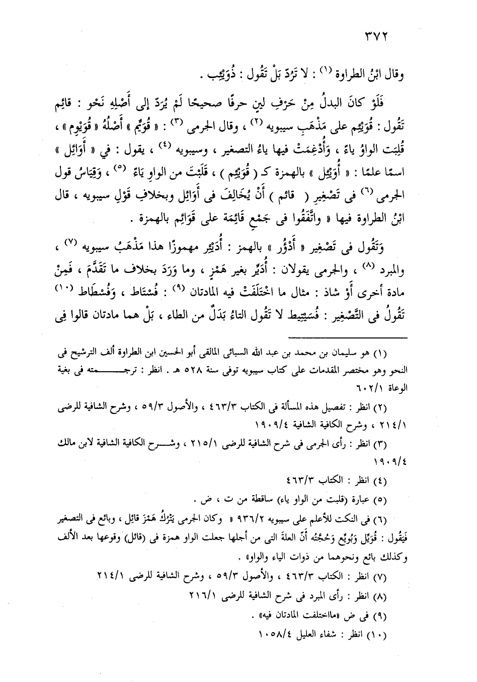وتقول في تصغير «أدؤر» بالهمز: أديئر مهموزًا هذا مذهب سيبويه، والمبرد، والجرمي يقولان: أدير بغير همز، وما ورد بخلاف ما تقدم، فمن مادة أخرى أو شاذ: مثال ما اختلفت فيه المادتان: فستاط، وفسطاط تقول في التصغير: فسييط لا تقول التاء بدل من الطاء، بل هما مادتان قالوا في