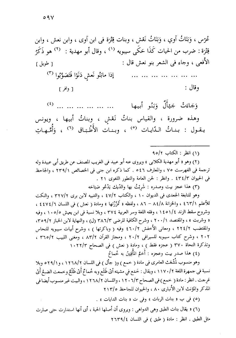 عرس، وبنات آوي، وبنات نعش، وبنات قترة في ابن آوى، وابن نعش، وابن قترة: ضرب من الحيات كذا حكى سيبويه، وقال أبو مهدية: هو ذكر الأفعى، وجاء في الشعر بنون نعش قال: