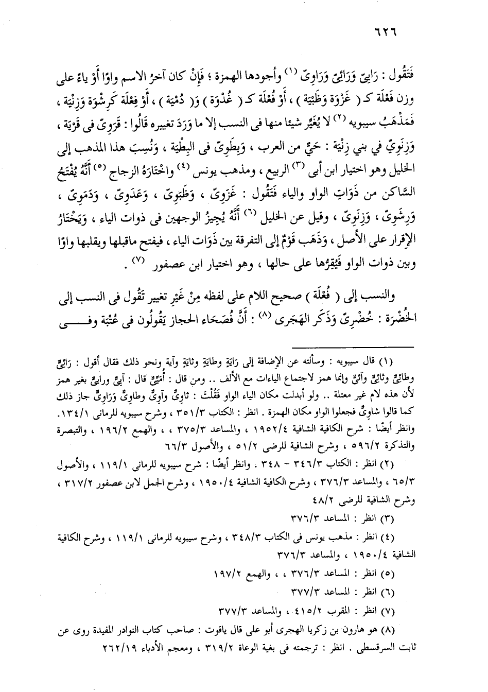فتقول: رايى ورائى وراوى وأجودها الهمزة؛ فإن كان آخر الاسم واوًا أو ياء على وزن فعلة كـ (غزوة وظبية) أو فعلة كـ (غدوة) و (دمية)، أو فعلة كرشوة وزنية، فمذهب سيبويه لا يغير شيئًا منها في النسب إلا ما ورد تغييره قالوا: قروى في قرية، وزنوي في بني زنية: حي من العرب، وبطوى في البطية، ونسب هذا المذهب إلى الخليل وهو اختيار ابن أبي الربيع، ومذهب يونس واختاره الزجاج أنه يفتح الساكن من ذوات الواو والياء فتقول: غزوى، وظبوى، وعدوى، ودموى، ورشوى، وزنوى، وقيل عن الخليل أنه يجيز الوجهين في ذوات الياء، ويختار الإقرار على الأصل، وذهب قوم إلى التفرقة بين ذوات الياء، فيفتح ما قبلها ويقلبها واوًا وبين ذوات الواو فيقرها على حالها، وهو اختيار ابن عصفور.