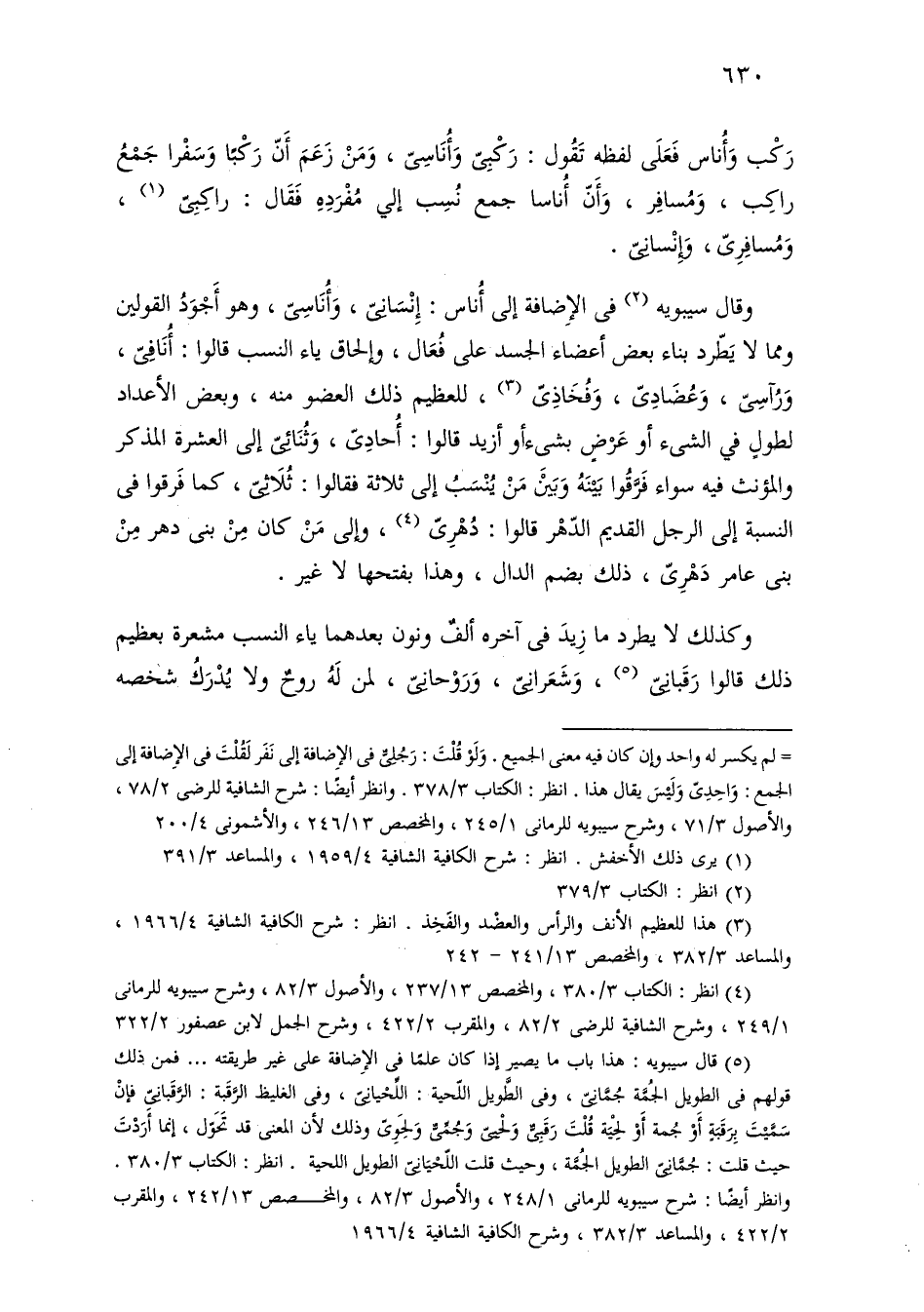 ركب وأناس فعلى لفظه تقول: ركبى وأناسى، ومن زعم أن ركبًا وسفرًا جمع راكب، ومسافر، وأن أناسا جمع نسب إلى مفرده فقال: راكبي، ومسافري، وإنساني.