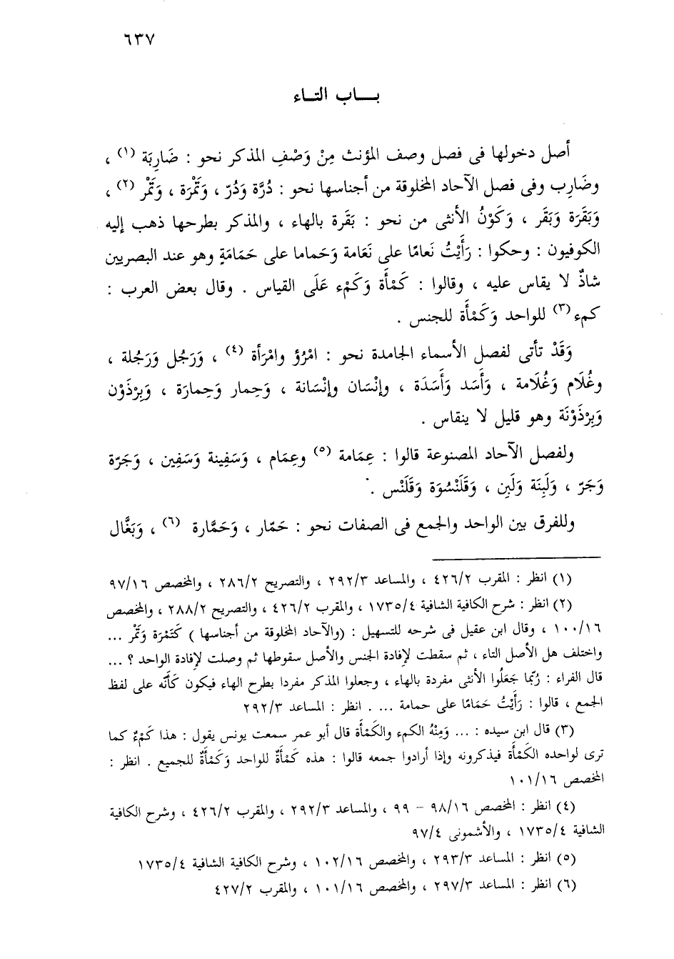 أصل دخولها في فصل وصف المؤنث من وصف المذكر نحو: ضاربة، وضارب وفي فصل الآحاد المخلوقة من أجناسها نحو: درة ودر، وتمرة، وتمر، وبقرة وبقر، وكون الأنثى من نحو: بقرة بالهاء، والمذكر بطرحها ذهب إليه الكوفيون: وحكوا: رأيت نعامًا على نعامة وحمامًا على حمامة وهو عند البصريين شاذ لا يقاس عليه، وقالوا: كمأة وكمء على القياس. وقال بعض العرب: كمء للواحد وكمأة للجنس.