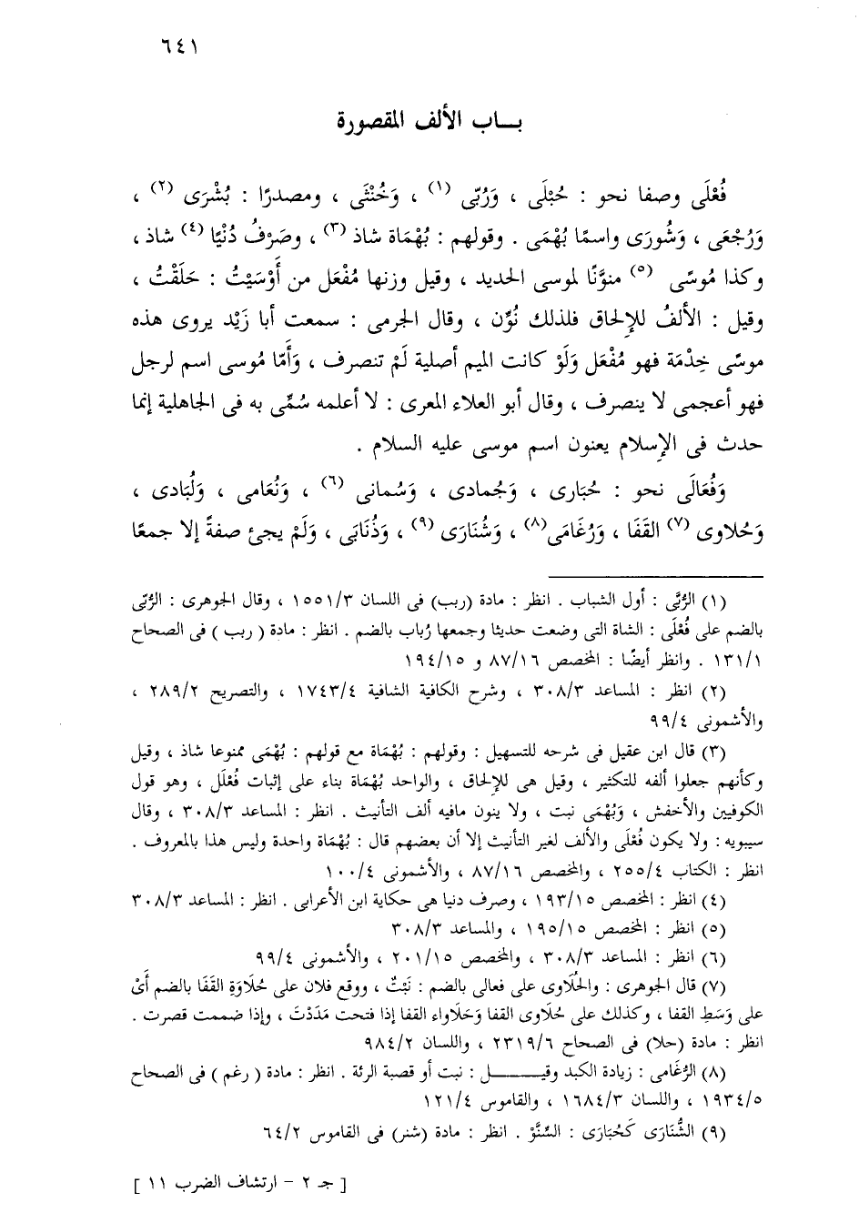 فعلى وصفا نحو: حبلى، وربى، وخنثى، ومصدرًا: بشرى، ورجعى، وشورى واسمًا بهمى. وقولهم: بهماة شاذ، وصرف دنيا شاذ، وكذا موسى منونًا لموسى الحديد، وقيل وزنها مفعل من أوسيت: حلقت، وقيل: الألف للإلحاق فلذلك نون، وقال الجرمي: سمعت أبا زيد يروي هذه موسى خدمة فهو مفعل ولو كانت الميم أصلية لم تنصرف، وأما موسى اسم لرجل فهو أعجمي لا ينصرف، وقال أبو العلاء المعري: لا أعلمه سمي به في الجاهلية إنما حدث في الإسلام يعنون اسم موسى عليه السلام.