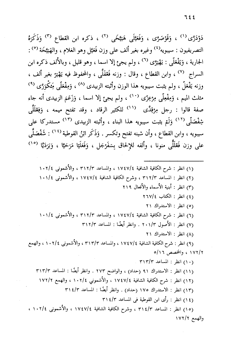 دودرى، وقوصرى، وفعيلى هبيخى، ذكره ابن القطاع وذكره التصريفيون: سيبويه وغيره بغير ألف على وزن فعيل وهو الغلام، والهبيخة: الجارية، ويفعلى: يهيرى، ولم يجيء إلا اسمًا، وهو قليل، وبالألف ذكره ابن السراج، وابن القطاع، وقال: وزنه فعفلى، والمحفوظ فيه يهير بغير ألف، وزنه يفعلى، ولم يثبت سيبويه هذا الوزن وأثبته الزبيدي، ومفعلى مكورى مثلث الميم، ومفعلى مرعزى، ولم يجيء إلا اسمًا، وزعم الزبيدي أنه جاء صفة قالوا: رجل مرقدي للكثير الرقاد، وقد تفتح ميمه، وفعللى شفصلى ولم يثبت سيبويه هذا البناء، وأثبته الزبيدي مستدركًا على سيبويه، وابن القطاع، وأن شينه تفتح وتكسر. وذكر ابن القوطية: شفصلى على وزن فعللى منونًا، وألفه للإلحاق بسفرجل، وفعليا مرحيا، وبرديا