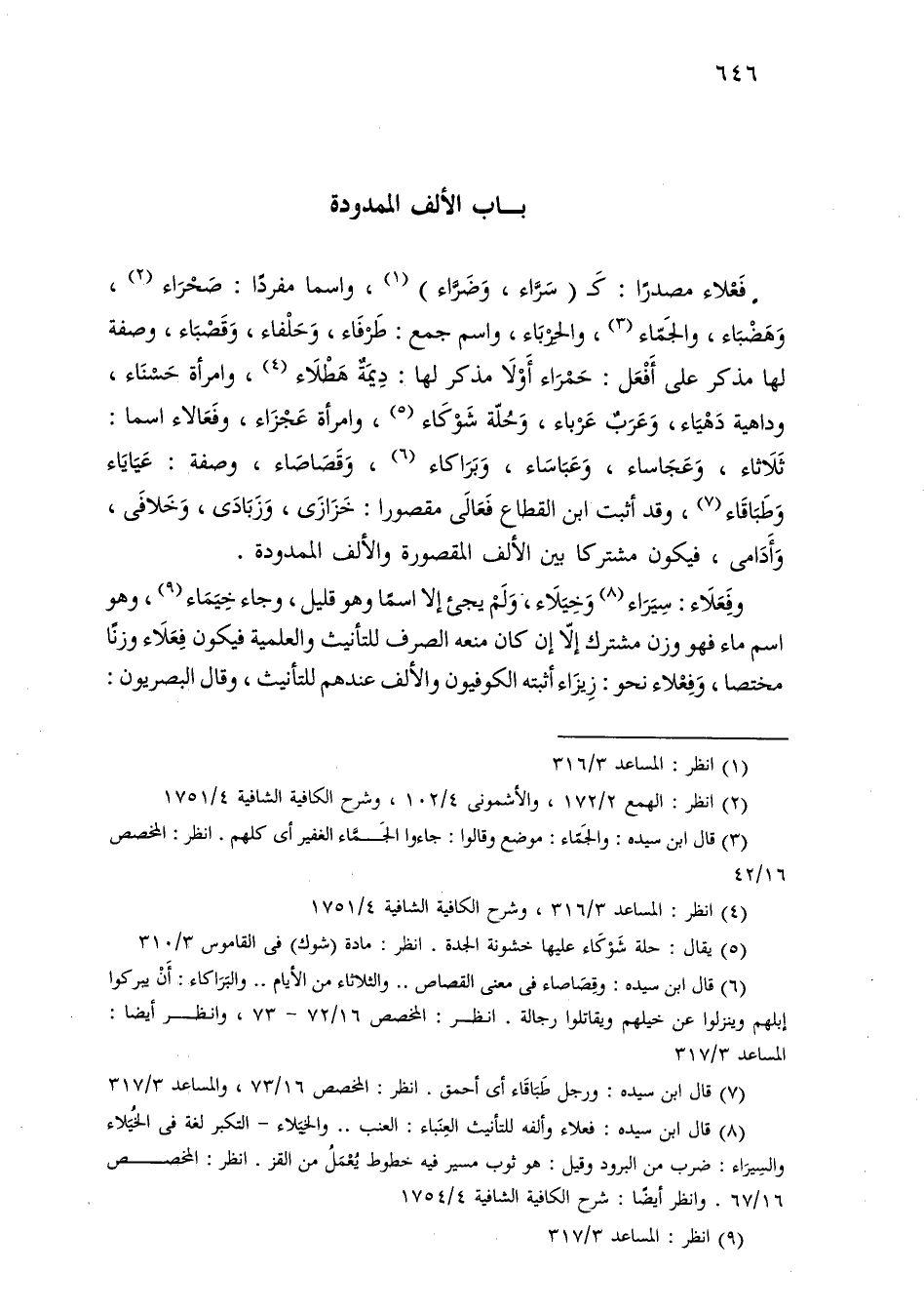 فعلاء مصدرًا: كـ (سراء، وضراء)، واسما مفردًا: صحراء، وهضباء، والجماء، والحرباء، واسم جمع: طرفاء، وحلفاء، وقصباء، وصفة لها مذكر على أفعل: حمراء أو لا مذكر لها: ديمة هطلاء، وامرأة حسناء، وداهية دهياء، وعرب عرباء، وحلة شوكاء، وامرأة عجزاء، وفعالاء اسما: ثلاثاء، وعجاساء، وعباساء، وبراكاء، وقصاصاء، وصفة: عياياء وطباقاء، وقد أثبت ابن القطاع فعالى مقصورا: خزازى، وزبادى، وخلافى، وأدامى، فيكون مشتركًا بين الألف المقصورة والألف الممدودة.
