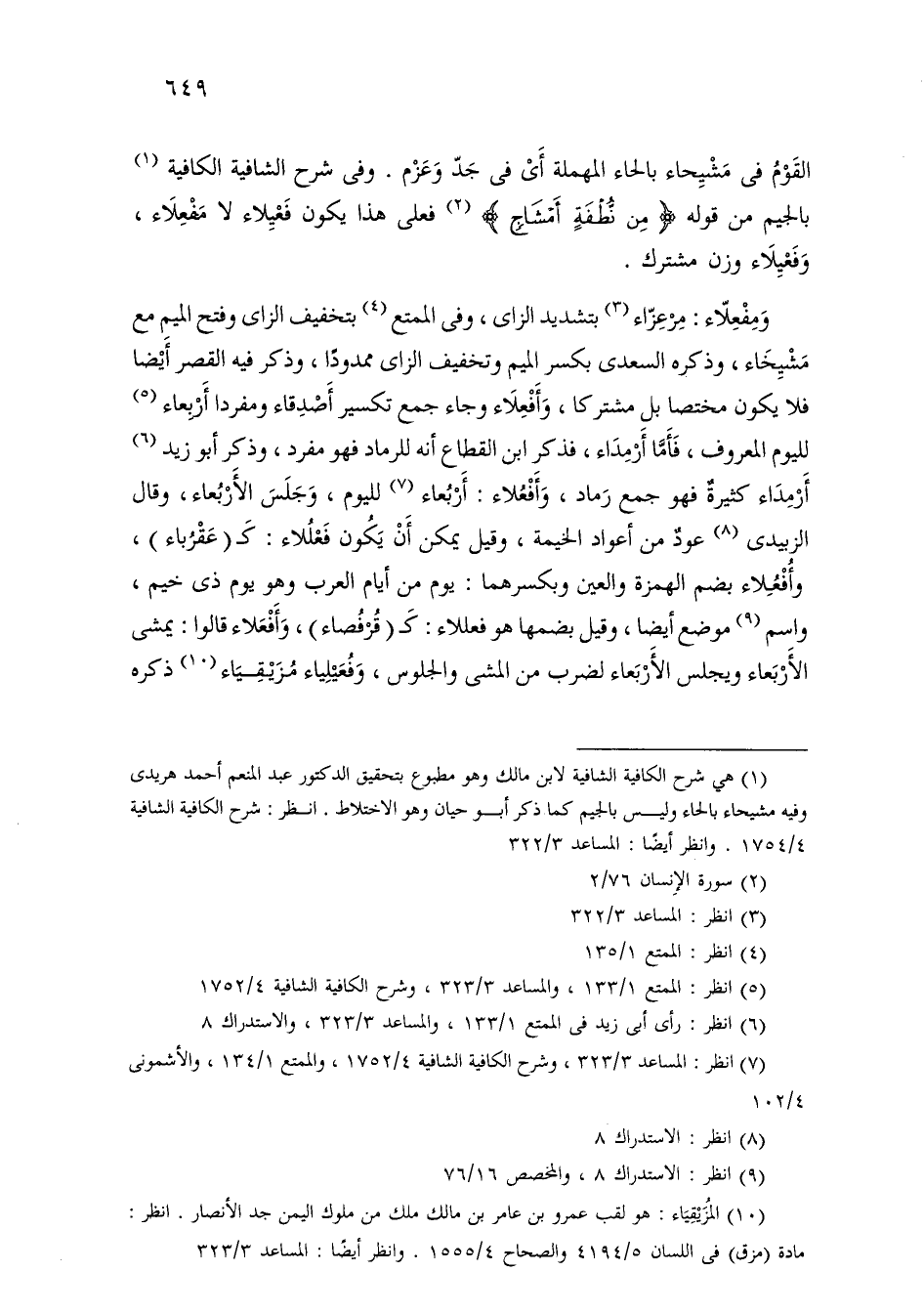 ومفعلاء: مرعزاء بتشديد الزاي، وفي الممتع بتخفيف الزاي وفتح الميم مع مشيخاء، وذكره السعدي بكسر الميم وتخفيف الزاي ممدودًا، وذكر فيه القصر أيضًا فلا يكون مختصًا بل مشتركًا، وأفعلاء وجاء جمع تكسير أصدقاء ومفردا أربعاء لليوم المعروف، فأما أرمداء، فذكر ابن القطاع أنه للرماد فهو مفرد، وذكر أبو زيد أرمداء كثيرة فهو جمع رماد، وأفعلاء: أربعاء لليوم، وجلس الأربعاء، وقال الزبيي عود من أعواد الخيمة، وقيل يمكن أن يكون فعللاء: كـ ـ (عقرباء)، وأفعلاء بضم الهمزة والعين وبكسرهما: يوم من أيام العرب وهو يوم ذي خيم، واسم موضع أيضًا، وقيل بضمها هو فعللاء: كـ (قرفصاء)، وأفعلاء قالوا: يمشي الأربعاء ويجلس الأربعاء لضرب من المشي والجلوس، وفعيلياء مزيقياء ذكره