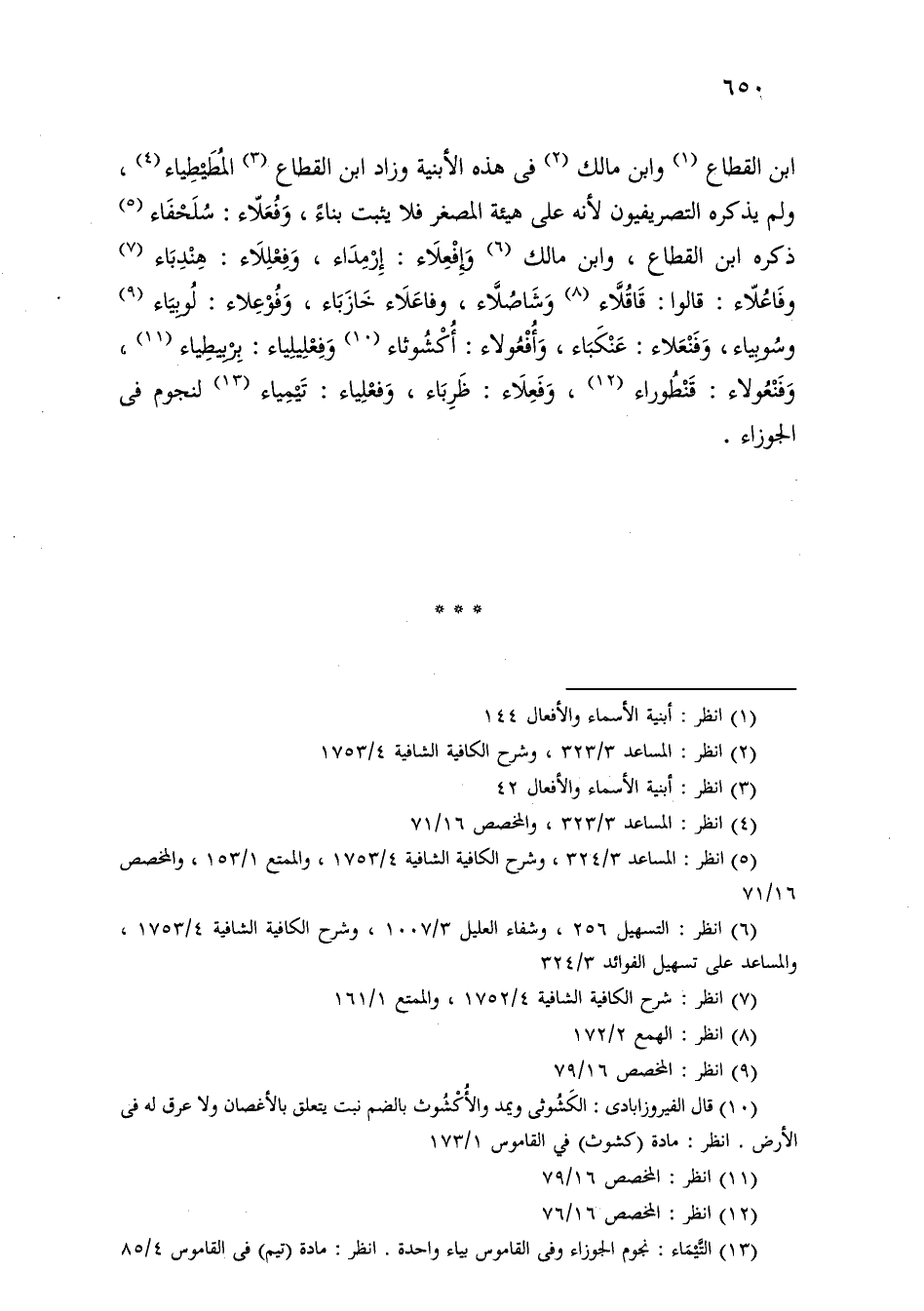 ابن القطاع وابن مالك في هذه الأبنية وزاد ابن القطاع المطيطياء، ولم يذكره التصريفيون لأنه على هيئة المصغر فلا يثبت بناء، وفعلاء: سلحفاء ذكره ابن القطاع، وابن مالك وإفعلاء: إرمداء، وفعللاء: هندباء وفاعلاء: قالوا: قاقلاء، وشاصلاء، وفاعلاء خازباء، وفوعلاء: ولبياء وسوبياء، وفنعلاء: عنكباء، وأفعولاء: أكشوشاء، وفعليلياء: بربيطياء، وفنعولاء: قنطوراء، وفعلاء: ظرباء، وفعلياء: تيمياء لنجوم في الجوزاء.