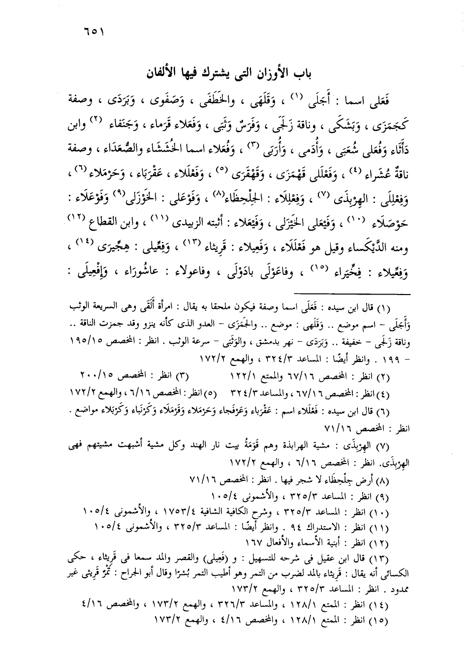 فعلى اسما: أجلى، وقلهى، والخطفى، وصفوى، وبردى، وصفة كجمزى، وبشكى، وناقة زلجى، وفرس وثبى، وفعلاء قرماء، وجنفاء وابن دأثاء وفعلى شعبى، وأدمى، وأربى، وفعلاء اسما الخششاء والصعداء، وصفة ناقة عشراء، وفعللى قهمزى، وقهقرى، وفعللاء، عقرباء، وحرملاء، وفعللى: الهربذى، وفعللاء: الجلحظاء، وفوعلى: الخوزلى وفوعلاء: حوصلاء، وفيعلى الخيزلى، وفيعلاء: أثبته الزبيدي، وابن القطاع ومنه الديكساء وقيل هو فعللاء، وفعيلاء: قريثاء، وفعيلى: هجيرى، وفعيلاء: فخيراء، وفاعولى بادولى، وفاعولاء: عاشوراء، وإفعيلى:
