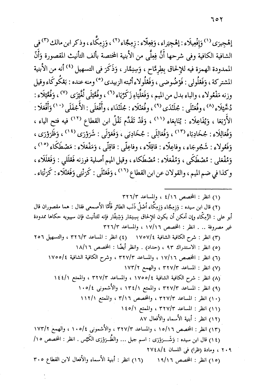 إهجيرى وإفعيلاء: إهجيراء، وفعلاء: زمجاء، وزمكاء، وذكر ابن مالك في الشافية الكافية وفي شرحها أن فعلى من الأبنية المختصة بألف التأنيث المقصورة وأن الممدودة الهمزة فيه للإلحاق بطرماح، وسنمار، وذكر في التسهيل أنه من الأبنية المشتركة، وفعلولى: فوضوضى، وفعلولاء أثبته الزبيدي ومنه عنده: بعكوكاء وقيل وزنه مفعولاء، والباء بدل من الميم وفعلياء زكرياء، وفعيلى لغيزى، وفعيلاء: دخيلاء، وفعنلى: جلندى، وفعنلاء: جلنداء، وأفعلى: الأجفلى وأفعلا: الأربعا، ويفاعلاء: ينابعاء، وقد تقدم نقل ابن القطاع فيه فتح الياء، وفعاللاء: جخادباء، وفعاللى: جخادبى، وفعولى: شرورى، وظرورى، وفعولاء: شجوجاء، وفاعلاء: قاقلاء، وفاعلى: قاقلى، ومفعلاء: مصطكاء، ومفعلى: مصطكى، ومفعلاء: مصطكاء، وقيل الميم أصلية فوزنه فعللي: وفعللاء، وكذا في ضم الميم، والقولان عن ابن القطاع، وفعنلى: كرنبى وفعنلاء: كرنباء.