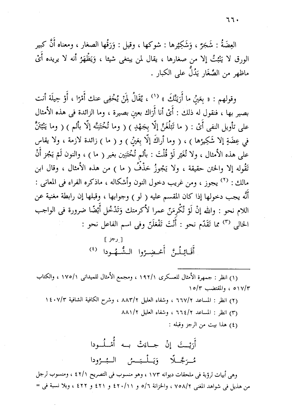 وقولهم: «بعين ما أرينك»، يقال لمن يخفى عنك أمرًا، أو حيلة أنت بصير بها، فنقول له ذلك: أي أنا أراك بعين بصيرة، وما الزائدة في هذه الأمثال على تأويل النفي أي: (ما تبلغن إلا بجهد) (وما تختنه إلا بألم) (وما ينبتن في عضة إلا شكيرها)، (وما أراك إلا بعين) و (ما) زائدة لازمة، ولا يقاس على هذه الأمثال، ولا تغير لو قلت: بألم تختنين بغير (ما)، والنون لم يجز أن تقوله إلا والختن حقيقة، ولا يجوز حذف (ما) من هذه الأمثال، وقال ابن مالك: يجوز، ومن غريب دخول النون وأشكاله، ما ذكره الفراء في المعاني: أنه يجب دخولها إذا كان المقسم عليه (لو) وجوابها، وقبلها إن رابطة مغنية عن اللام نحو: والله إن لو تكرمن عمرا لأكرمتك وتدخل أيضًا ضرورة في الواجب الخالي مما تقدم نحو: أنت تفعلن وفي اسم الفاعل نحو: