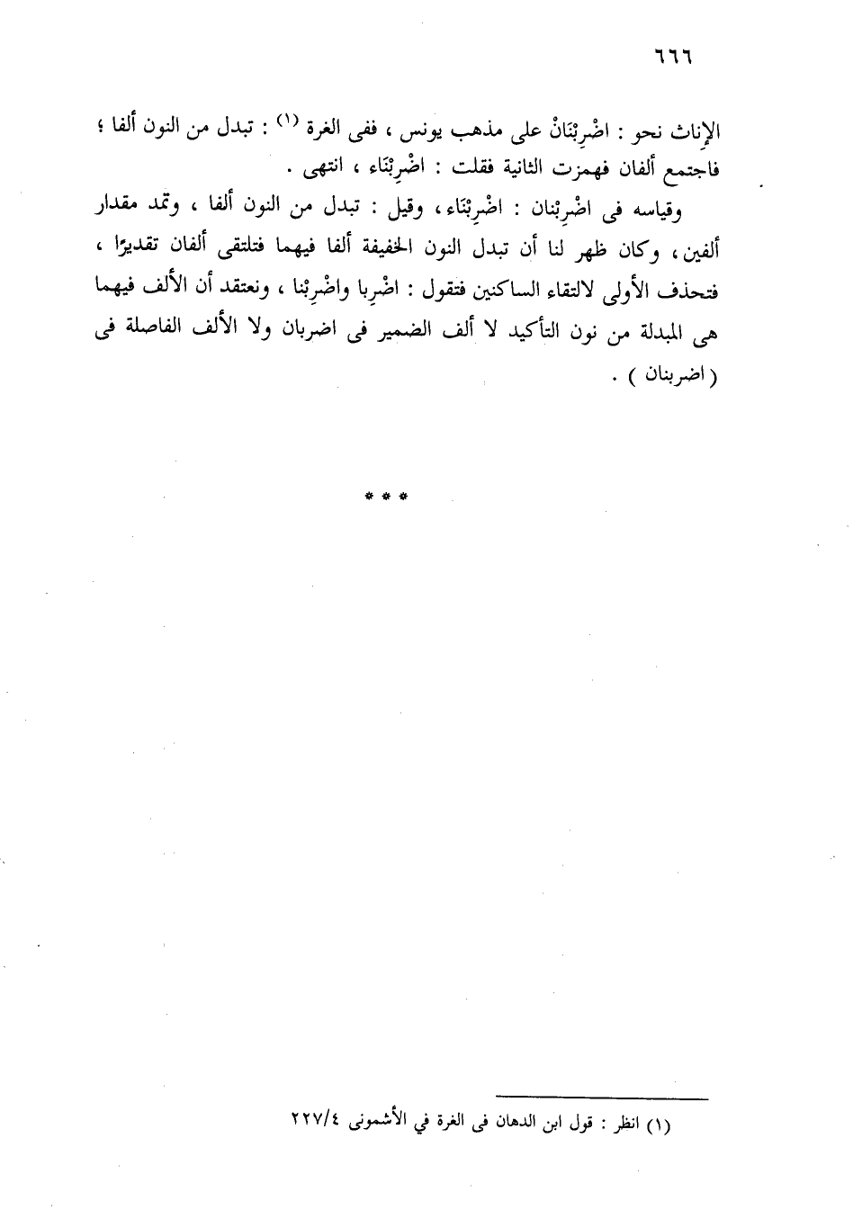 وقياسه في اضربنان: اضربناء، وقيل: تبدل من النون ألفا، وتمد مقدار ألفين، وكان ظهر لنا أن تبدل النون الخفيفة ألفا فيهما فتلتقي ألفان تقديرًا، فتحذف الأولى لالتقاء الساكنين فتقول: اضربا واضربنا، ونعتقد أن الألف فيهما هي المبدلة من نون التأكيد لا ألف الضمير في اضربان ولا الألف الفاصلة في (اضربنان).