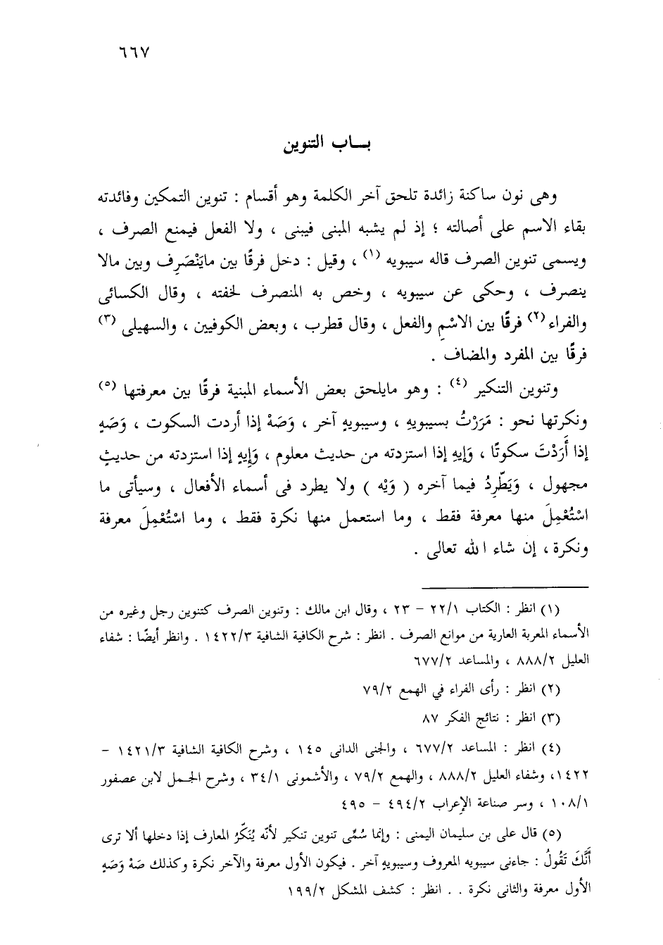 وهي نون ساكنة زائدة تلحق آخر الكلمة وهو أقسام: تنوين التمكين وفائدته بقاء الاسم على أصالته؛ إذ لم يشبه المبني فيبنى، ولا الفعل فيمنع الصرف، ويسمى تنوين الصرف قاله سيبويه، وقيل: دخل فرقًا بين ما ينصرف وبين ما لا ينصرف، وحكى عن سيبويه، وخص به المنصرف لخفته، وقال الكسائي والفراء فرقًا بين الاسم والفعل، وقال قطرب، وبعض الكوفيين، والسهيلي فرقًا بين المفرد والمضاف.