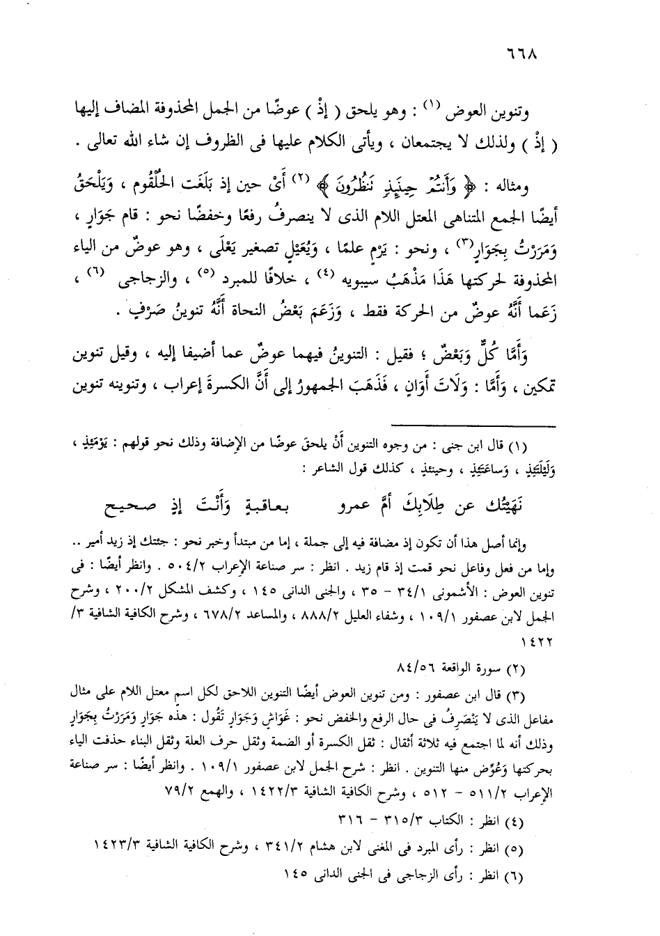 ومثاله: [وأنتم حينئذ تنظروني] أي حين إذ بلغت الحلقوم، ويلحق أيضًا الجمع المتناهي المعتل اللام الذي لا ينصرف رفعًا وخفضًا نحو: قام جوار، ومررت بجوار، ونحو: يرم علمًا، ويعيل تصغير يعلى، وهو عوض من الياء المحذوفة لحركتها هذا مذهب سيبويه، خلافًا للمبرد، والزجاجي، زعمًا أنه عوض من الحركة فقط، وزعم بعض النحاة أنه تنوين صرف.