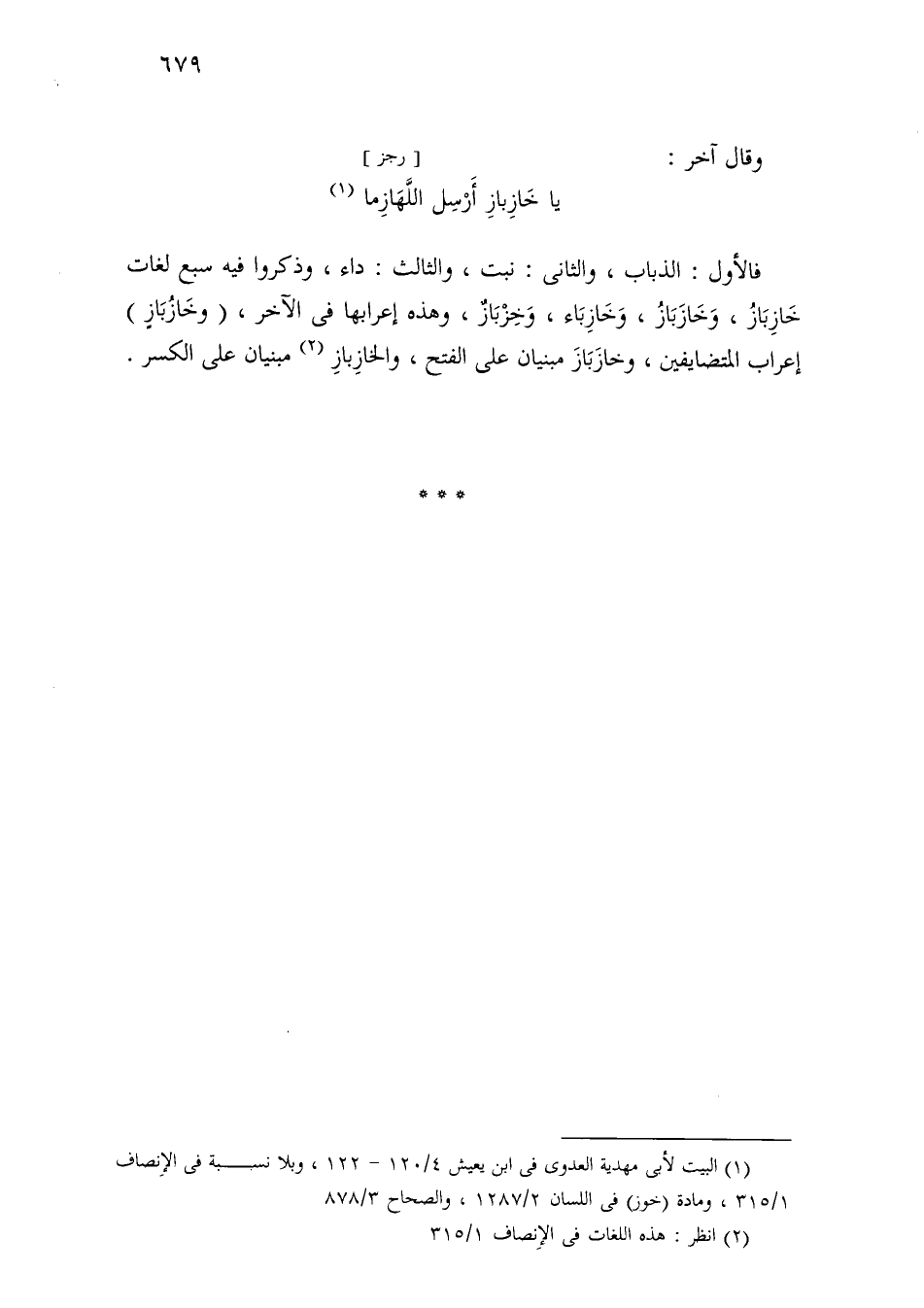 فالأول: الذباب، والثاني: نبت، والثالث: داء، وذكروا فيه سبع لغات خازباز، وخازباز، وخازباء، وخزباز، وهذه إعرابها في الآخر، (وخازباز) إعراب المتضايفين، وخازباز مبنيان على الفتح، والخازباز مبنيان على الكسر.
