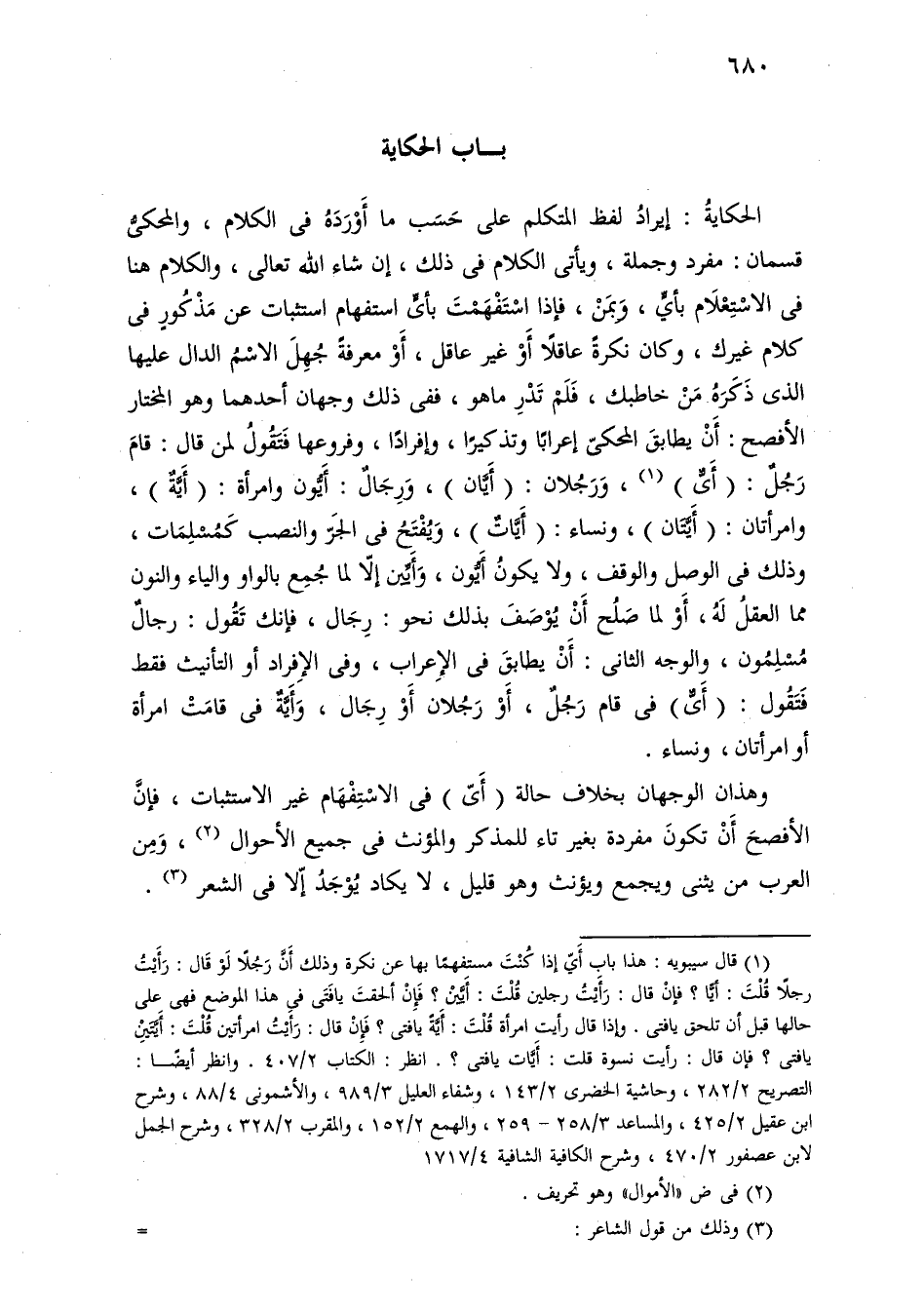 الحكاية: إيراد لفظ المتكلم على حسب ما أورده في الكلام، والمحكي قسمان: مفرد وجملة، ويأتي الكلام في ذلك، إن شاء الله تعالى، والكلام هنا في الاستعلام بأي، وبمن، فإذا استفهمت بأي استفهام استثبات عن مذكور في كلام غيرك، وكان نكرة عاقلاً أو غير عاقل، أو معرفة جهل الاسم الدال عليها الذي ذكره من خاطبك، فلم تدر ما هو، ففي ذلك وجهان أحدهما وهو المختار الأفصح: أن يطابق المحكي إعرابًا وتذكيرًا، وإفرادًا، وفروعها فتقول لمن قال: قام رجل: (أي)، ورجلان: (أيان)، ورجال: أيون وامرأة: (أية)، وامرأتان: (أيتان)، ,نساء: (أيات)، ويفتح في الجر والنصب كمسلمات، وذلك في الوصل والوقف، ولا يكون أيون، وأيين إلا لما جمع بالواو والياء والنون مما العقل له، أو لما صلح أن يوصف بذلك نحو: رجال، فإنك تقول: رجال مسلمون، والوجه الثاني: أن يطابق في الإعراب، وفي الإفراد أو التأنيث فقط فتقول: (أي) في قام رجل، أو رجلان أو رجال، وأية في قامت امرأة أو امرأتان، ونساء.