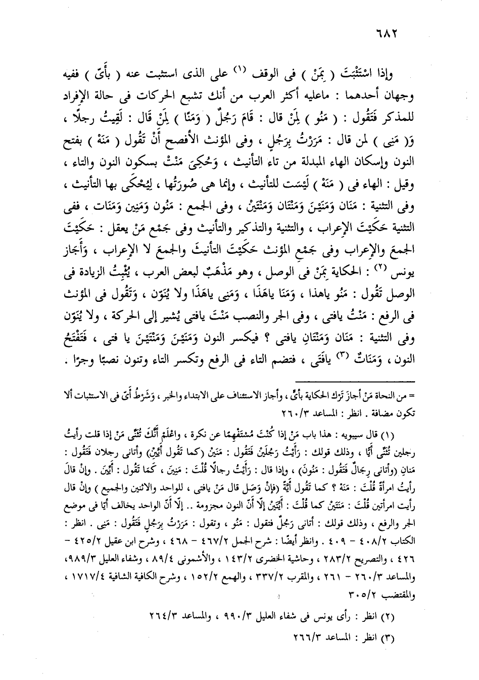 وإذا استثبت (بمن) في الوقف على الذي اسثبت عنه (بأي) ففيه وجهان أحدهما: ما عليه أكثر العرب من أنك تشبع الحركات في حالة الإفراد للمذكر فتقول: (منو) لمن قال: قام رجل (ومنا) لمن قال: لقيت رجلاً، و (منى) لمن قال: مررت برجل، وفي المؤنث الأفصح أن تقول (منه) بفتح النون وإسكان الهاء المبدلة من تاء التأنيث، وحكى منت بسكون النون والتاء، وقيل: الهاء في (منه) ليست للتأنيث، وإنما هي صورتها، ليحكى بها التأنيث، وفي التثنية: منان ومنين ومنتان ومنتين، وفي الجمع: منون ومنين ومنات، ففي التثنية حكيت الإعراب، والتثنية والتذكير والتأنيث وفي جمع من يعقل: حكيت الجمع والإعراب وفي جمع المؤنث حكيت التأنيث والجمع لا الإعراب، وأجاز يونسك الحكاية بمن في الوصل، وهو مذهب لبعض العرب، يثبت الزيادة في الوصل تقول: منو يا هذا، ومنا يا هذا، ومني يا هذا ولا ينون، وتقول في المؤنث في الرفع: منت يا فتى، وفي الجر والنصب منت يا فتى يشير إلى الحركة، ولا ينون وفي التثنية: منان ومنتان يا فتى؟ فيكسر النون ومنين ومنتين يا فتى، فتفتح النون، ومنات يا فتى، فتضم التاء في الرفع وتكسر التاء وتنون نصبًا وجرًا.